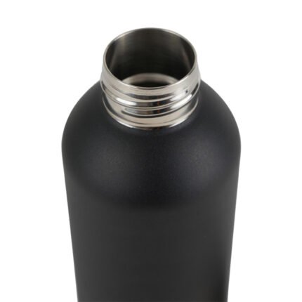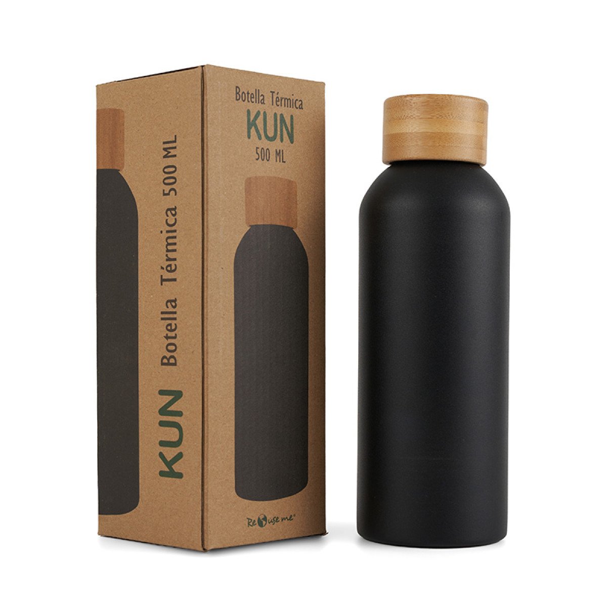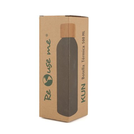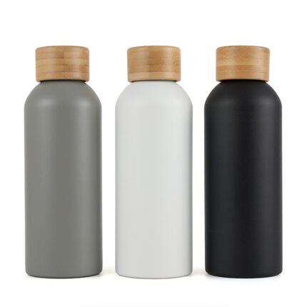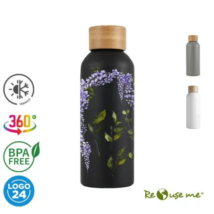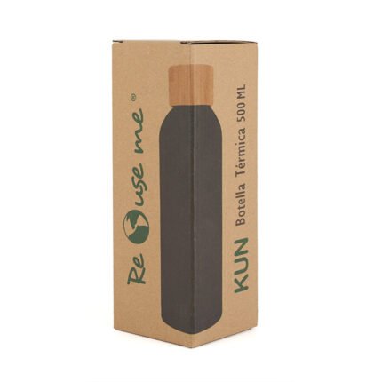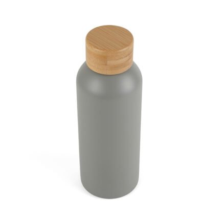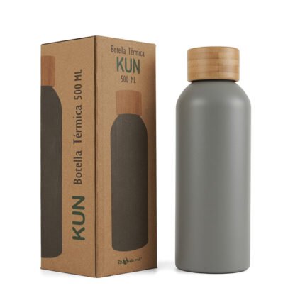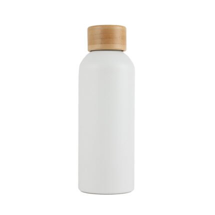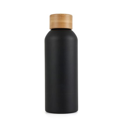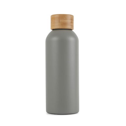 Botella de 500 ml confeccionada en doble pared de acero inoxidable con tapa a rosca de bambú. Mantiene las bebidas frías por 24 horas y calientes durante 12 horas.
