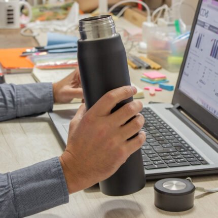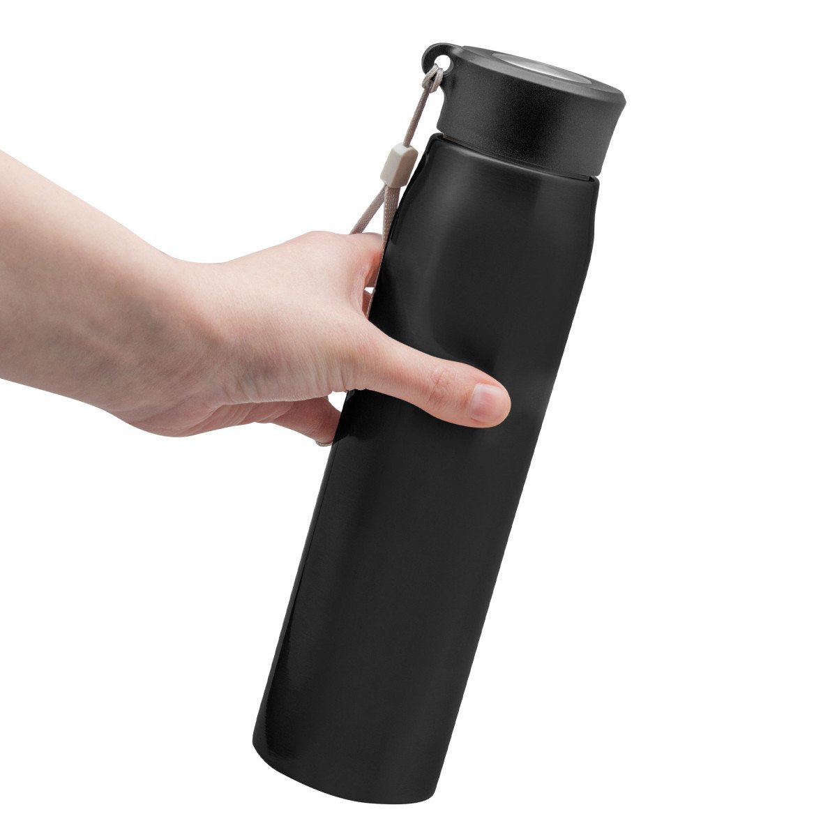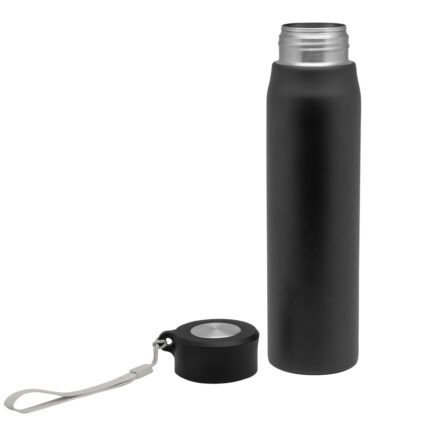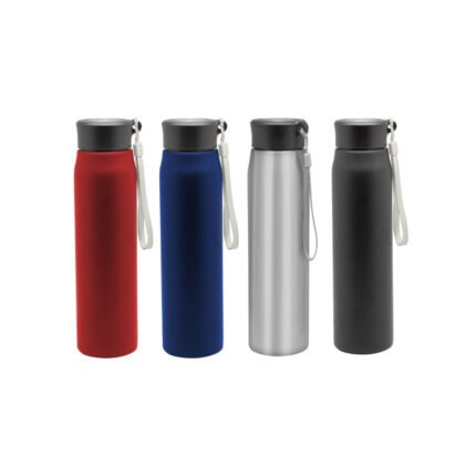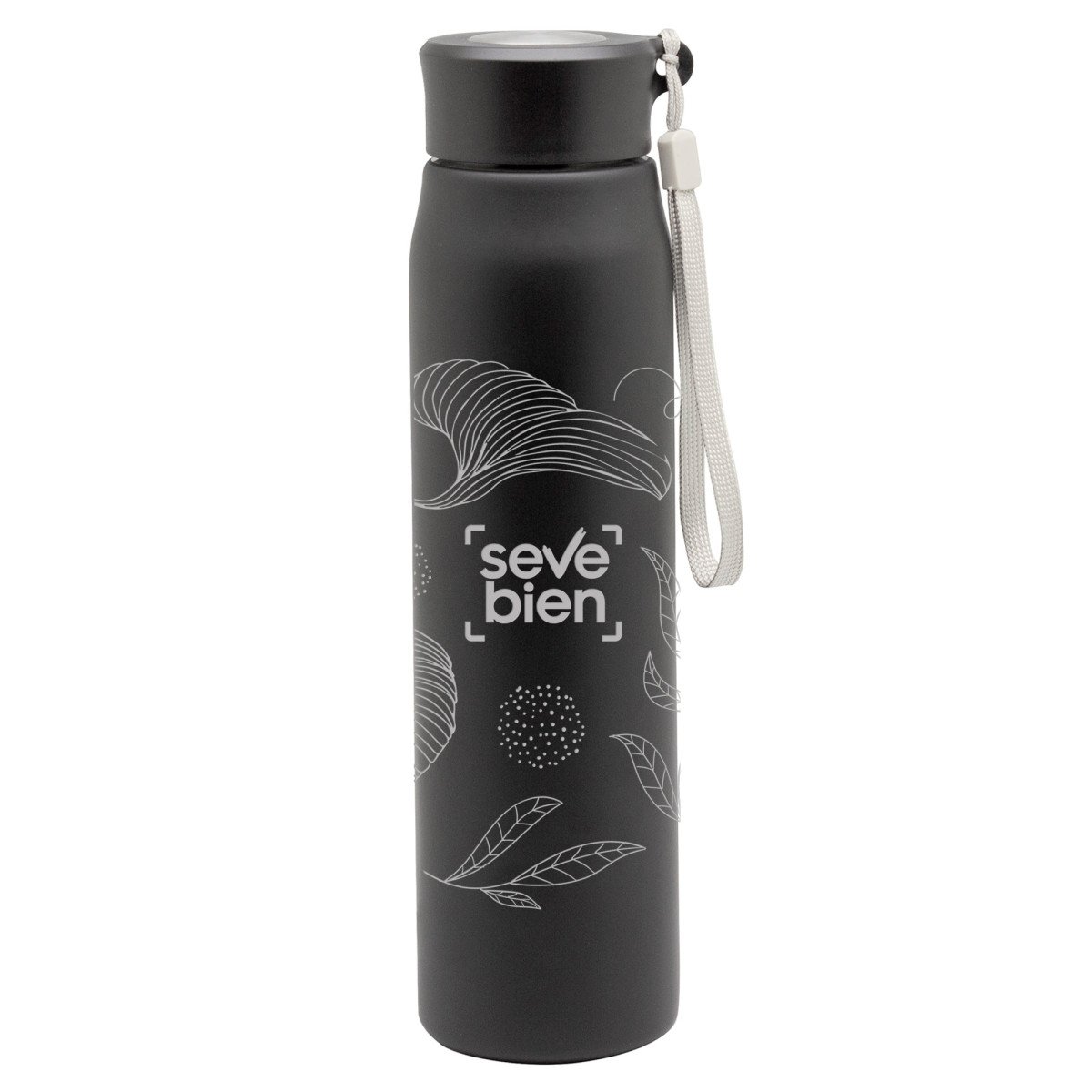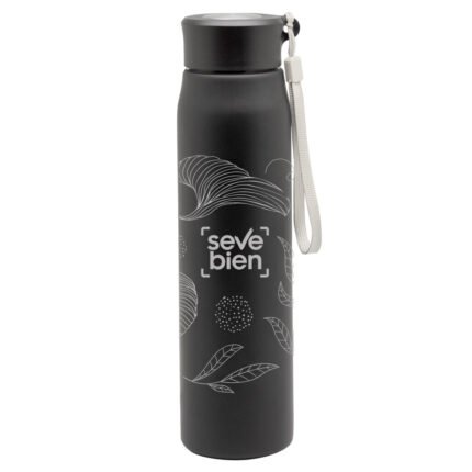Ø 6,5 x 25 cm. Capacidad 800ml. Acero inoxidable. Botella de acero inoxidable 304. Tapa combinada en plástico y acero inoxidable 201 con tira de color gris de 12 cm de largo. Ideal para llevarla a todos lados. Presentación en caja de regalo.