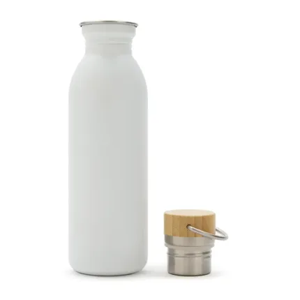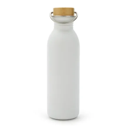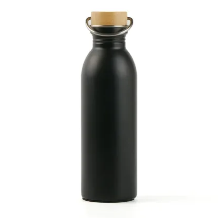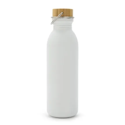 Botella de metal con tapa de bamboo. Cuenta con una manija de agarre sobre su tapa para fácil transporte y tiene una capacidad de 600ml. Ideal para actividades deportivas.