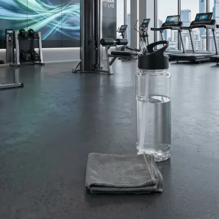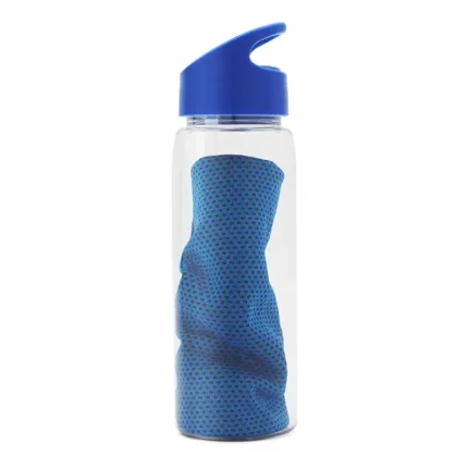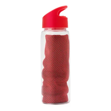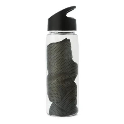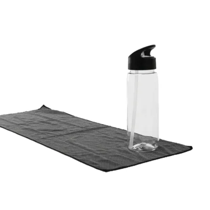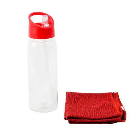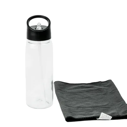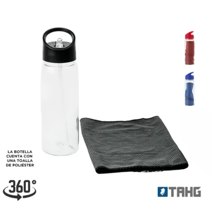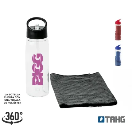 Botella deportiva fabricada en RPET con tapa de polipropileno. Cuenta con una toalla de poliéster, diseño ergonómico, tapa con sorbete y anillo para mejor agarre. Es ideal para entrenamientos, actividades al aire libre o jornadas deportivas intensas