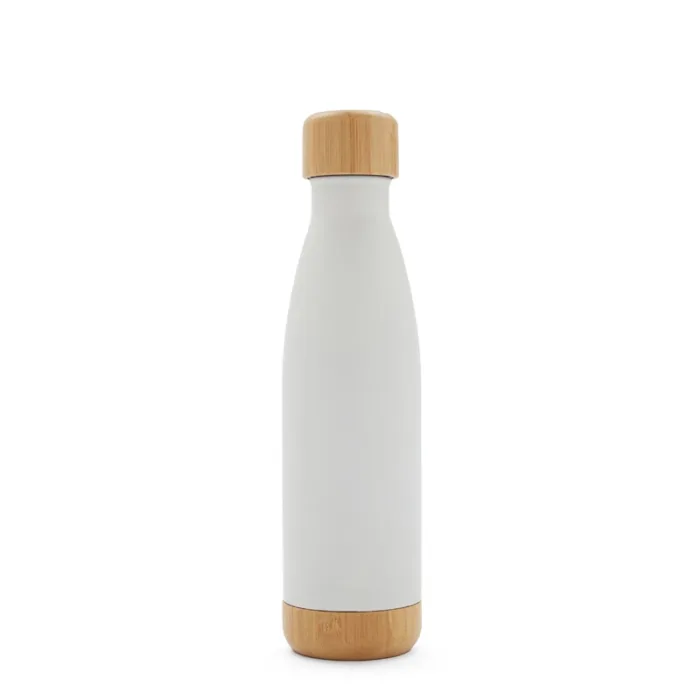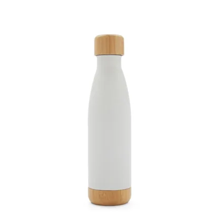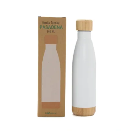Botella térmica de doble pared de acero inoxidable y tapa de bambú con capacidad de 500 ml. Mantiene las bebidas frías por 24 horas y calientes durante 12 horas. Ideal para deporte o uso diario.