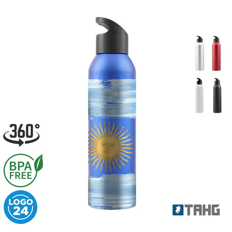 Sport Bottle reutilizable de aluminio con tapa rosca de PP y silicona. Cuenta con una tapa con agarre para facilitar su transporte. Producto libre de BPA. Producto aprobado por el I.N.A.L. para el contacto con alimentos. Medidas: 27 cm x 6,6 cm. Capacidad: 650 ml. Tahg.