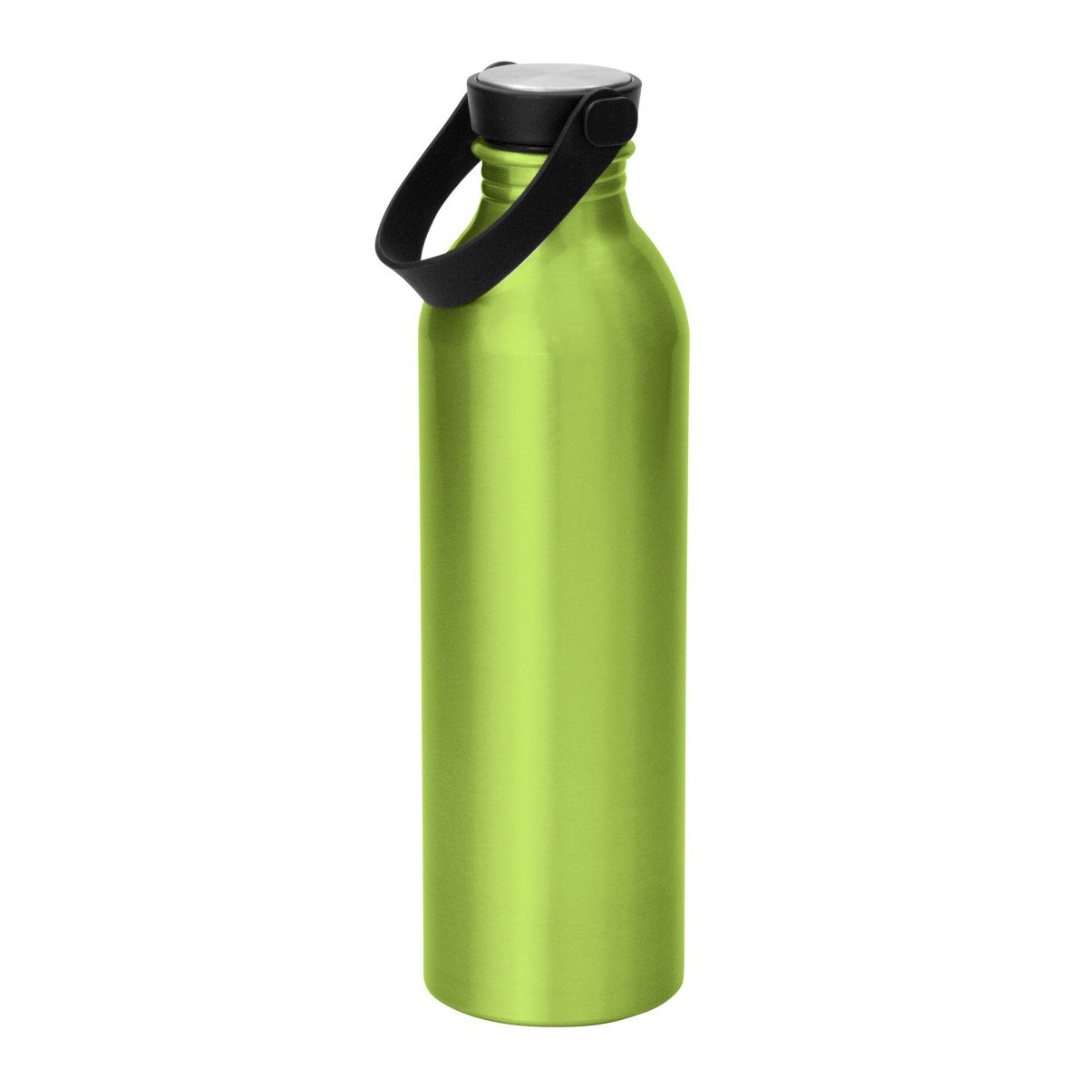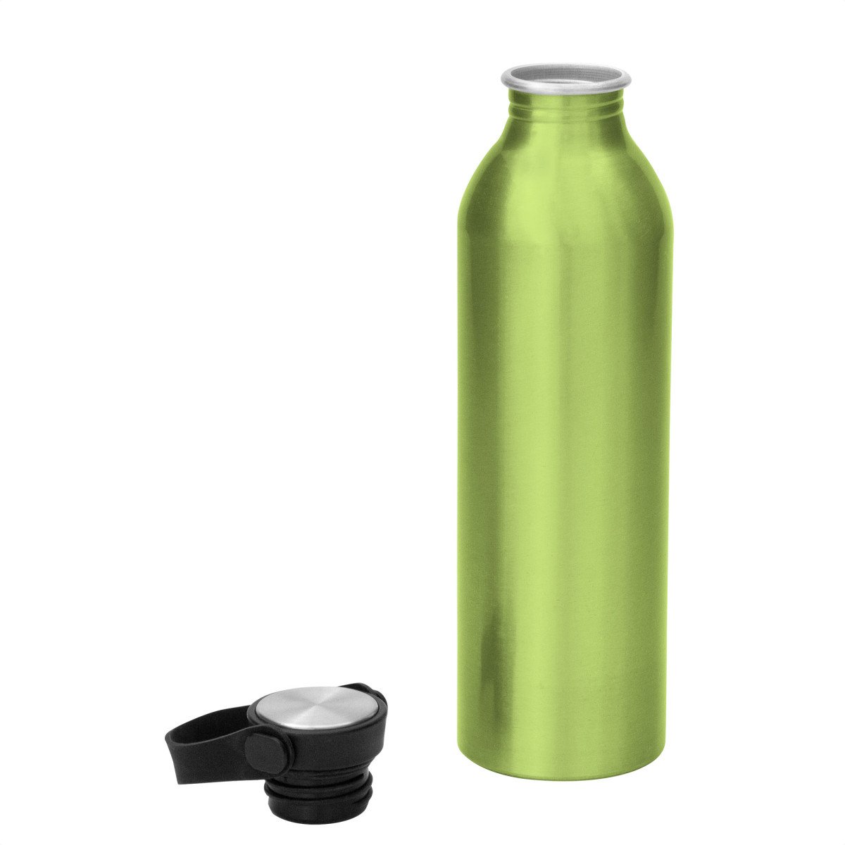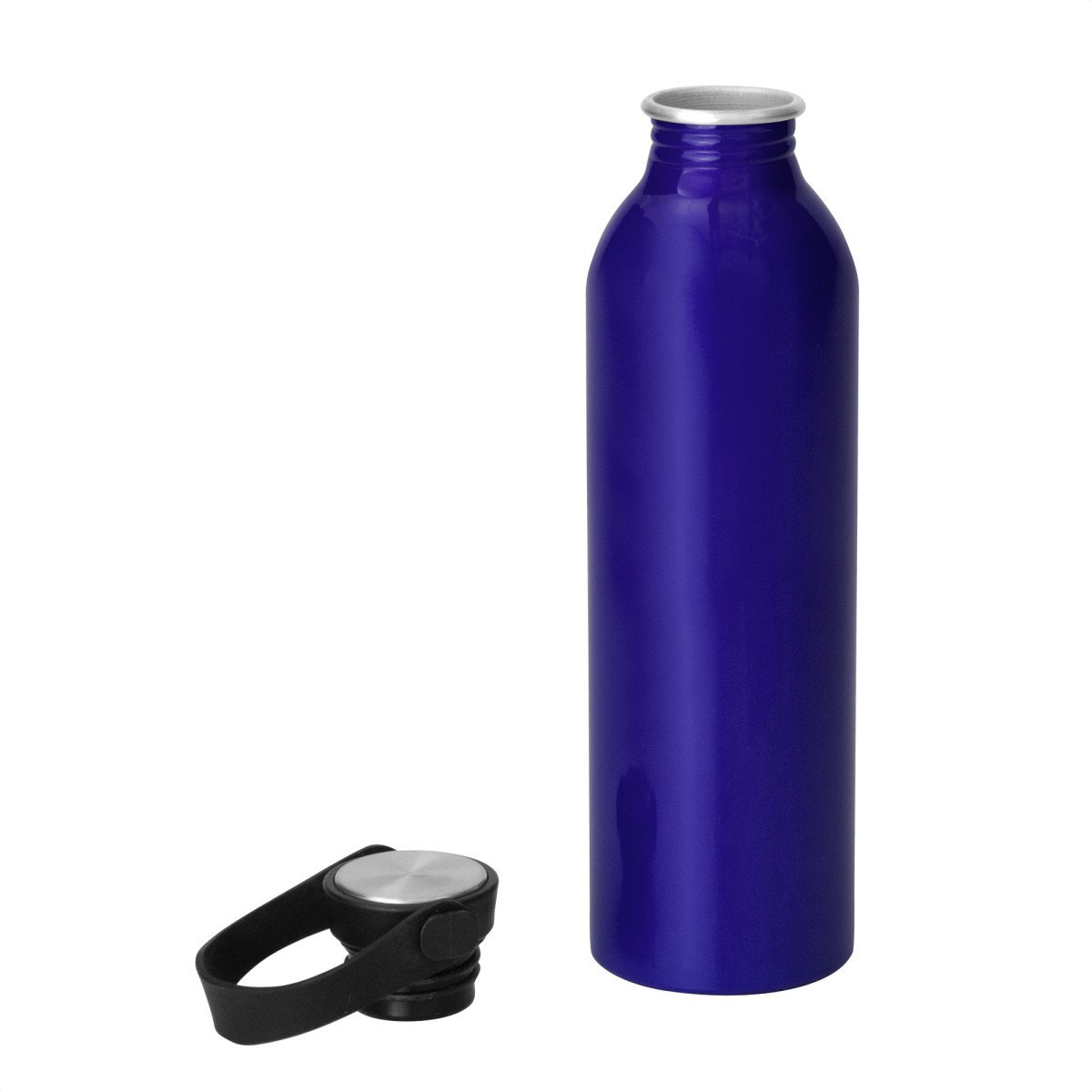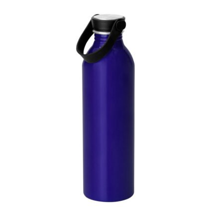 Hidratación a la mano.Botella de aluminio con acabado brillante. Tapa a rosca de acero inoxidable 201 y Polipropileno, con tira de silicona color negro.Medidas: Ø 6,5 x 23cm.