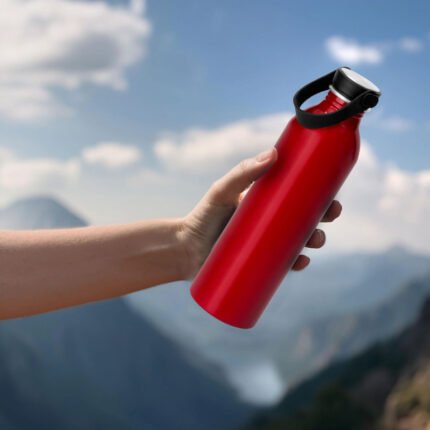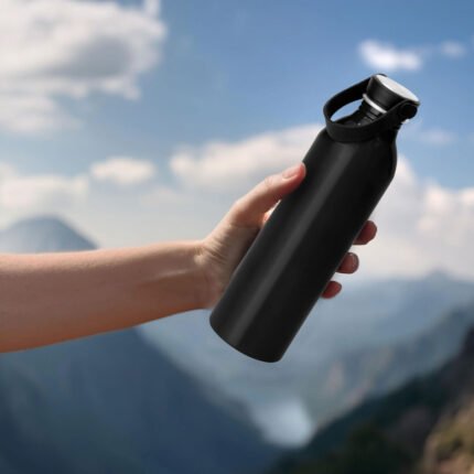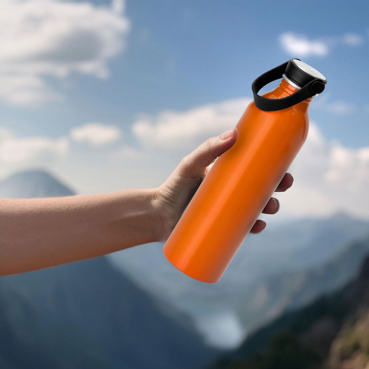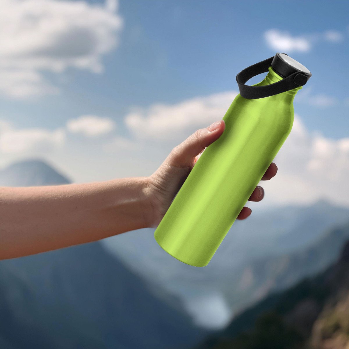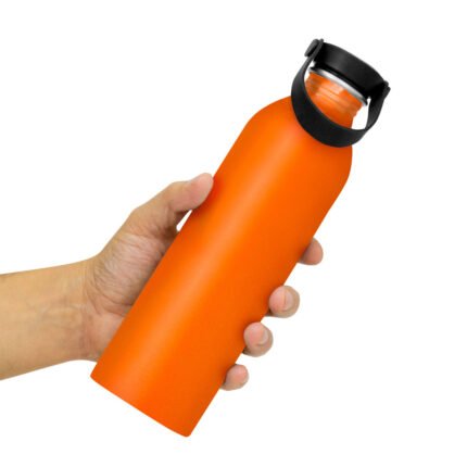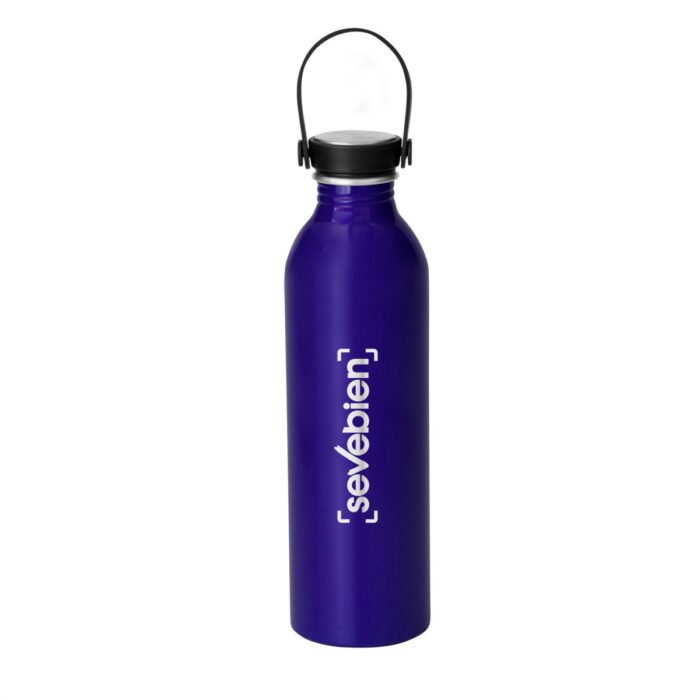 Hidratación a la mano.Botella de aluminio con acabado brillante. Tapa a rosca de acero inoxidable 201 y Polipropileno, con tira de silicona color negro.Medidas: Ø 6,5 x 23cm.