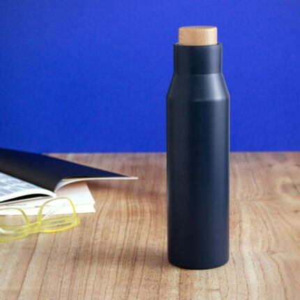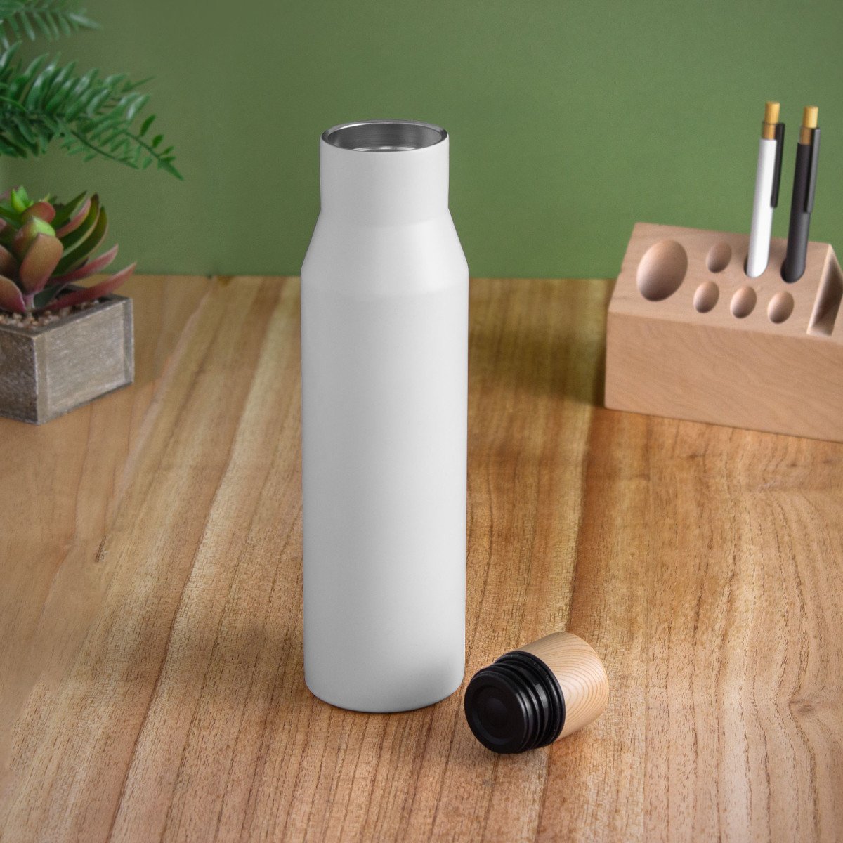 Ideal para llevar a tus actividades diarias.Botella doble pared, sellada al vacío. Interior de acero 304 y exterior de acero 201. Pintura acabado mate. Tapa a rosca con anillo de silicona, interior de acero 201 y exterior en polipropileno imitación bambú. Mantiene por más de 12 hs la temperatura de las bebidas calientes y 24 hs de las bebidas frías. Medidas: Ø 6,8 cm x 26 cm.
