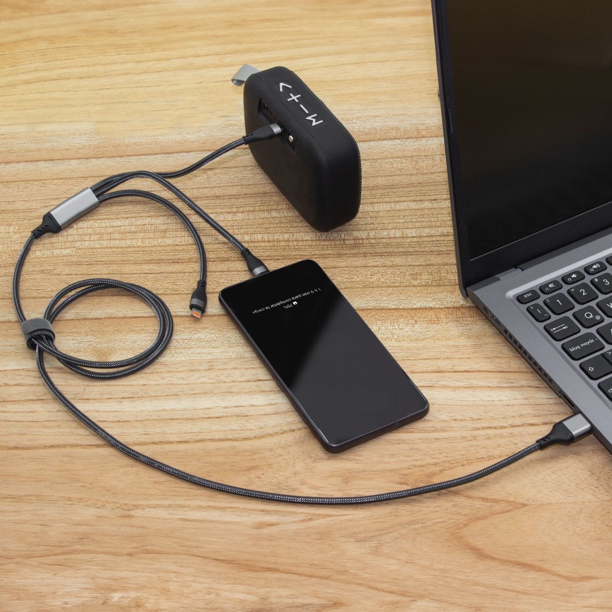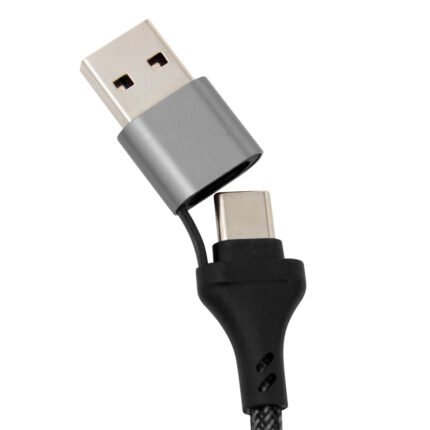 Carga al instante, vive sin límites.Cable de carga rápida. Entrada 2 en 1: USB y USB-C. Salida: USB-C, microUSB y lightning. Max 20V 3A. Color gun con toques naranjas en cada conector. Precinto de velcro fijada al cable. Medidas: 120 cm. (extendido).