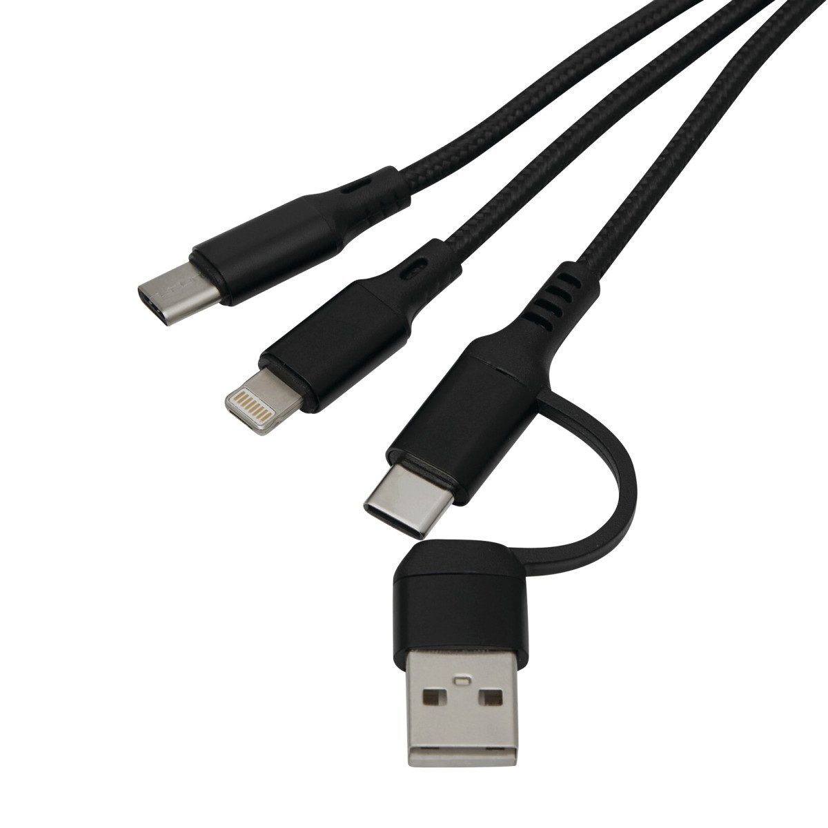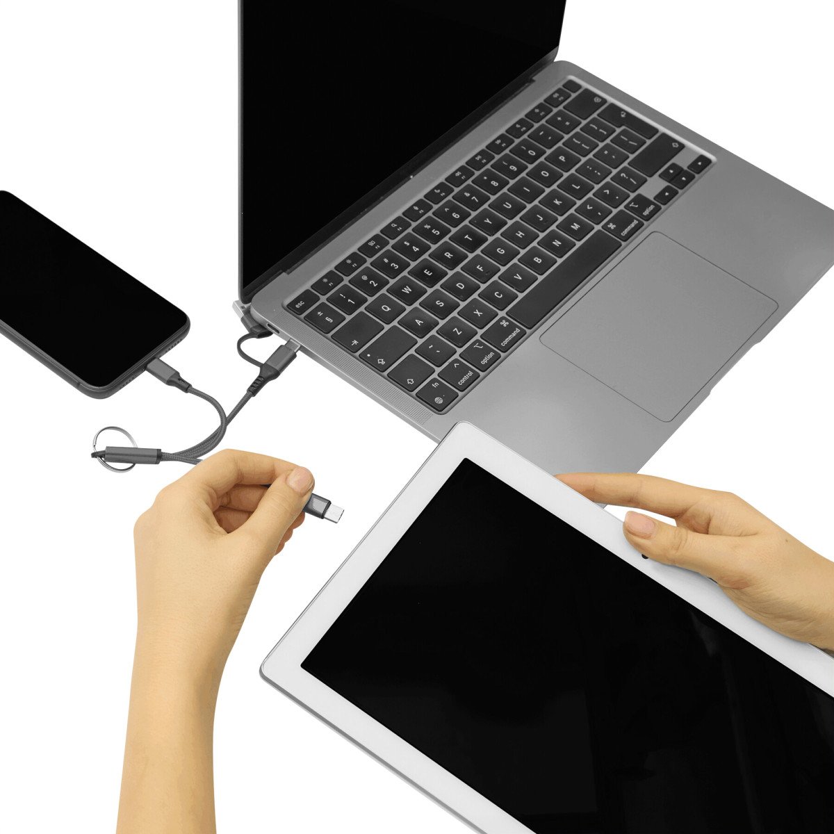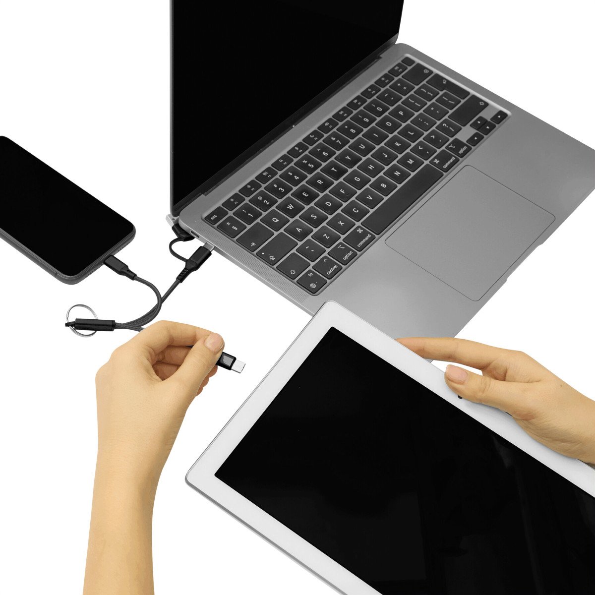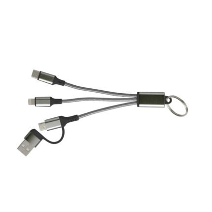 Todo lo que necesitas al alcance de tu manoCable de carga con llavero. Entrada: 2 en 1 (USB + USB tipo C). Salida: USB tipo C + lightning.Medidas: 15,5 cm.