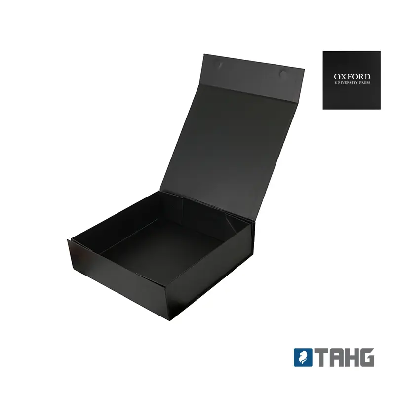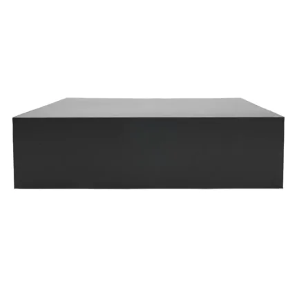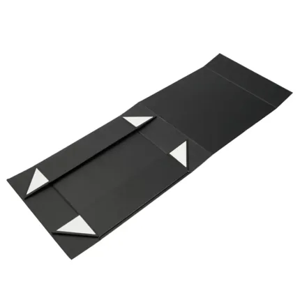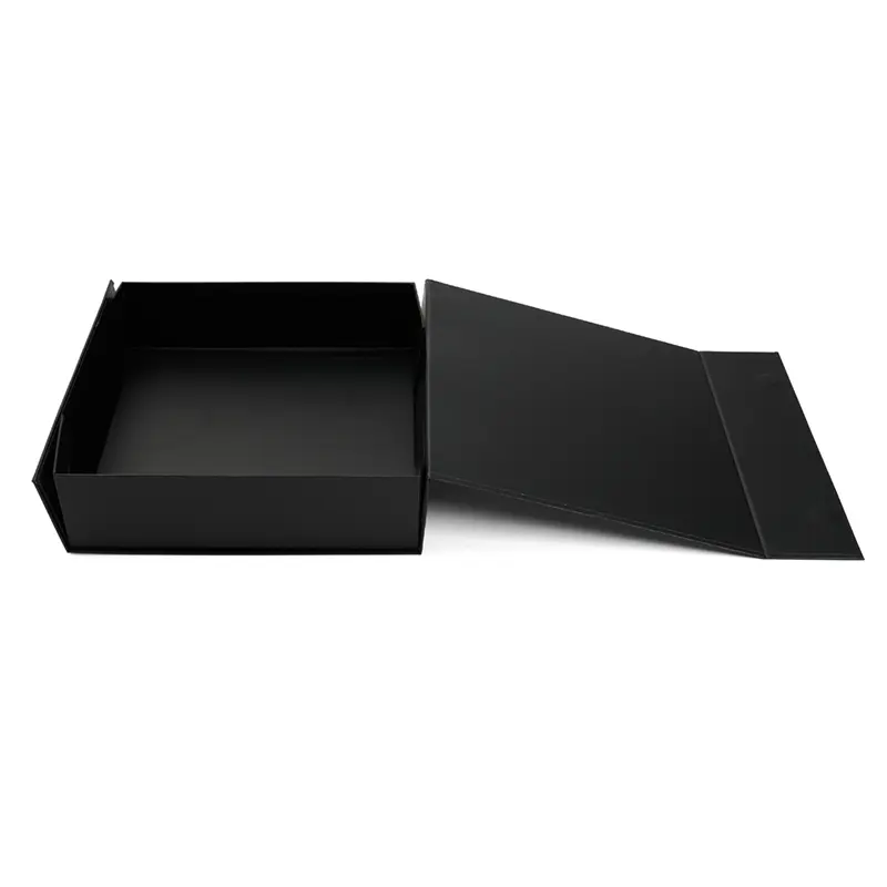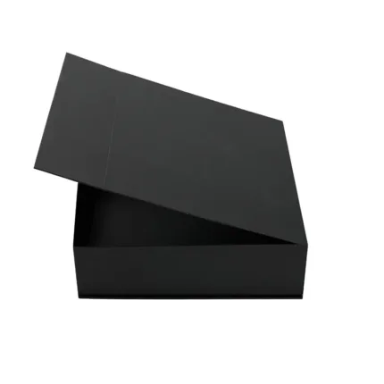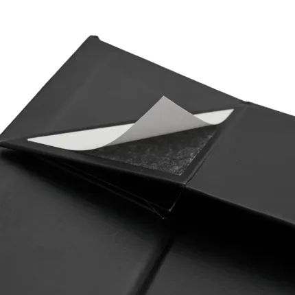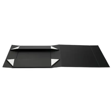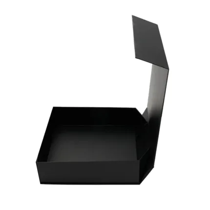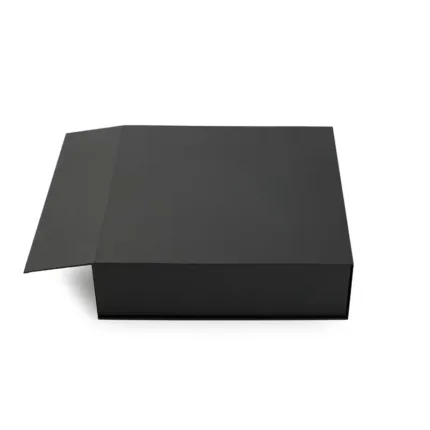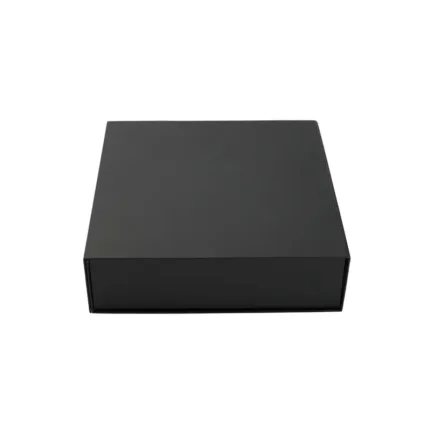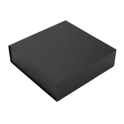 Caja plegable de cartón laminado mate en color negro, fabricada con materiales resistentes y diseño estructural reforzado. Cuenta con cierre magnético, esquinas con cinta adhesiva doble faz transparente para poder armarla y diseño plano que permite fácil almacenamiento y armado. Es ideal para presentaciones de productos, embalaje premium o uso como contenedor organizador en oficinas o eventos.