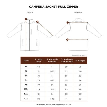 La campera cuenta con tres bolsillos con cierre, dos laterales inferiores y uno lateral derecho superior. La confección es una de las características de esta prenda, utilizando tapa costuras y detalles en sus terminaciones tanto exterior como interior. En el extremo superior del cierre, posee una solapa cobertora. La campera posee cuello alzado que proporciona protección y comodidad.