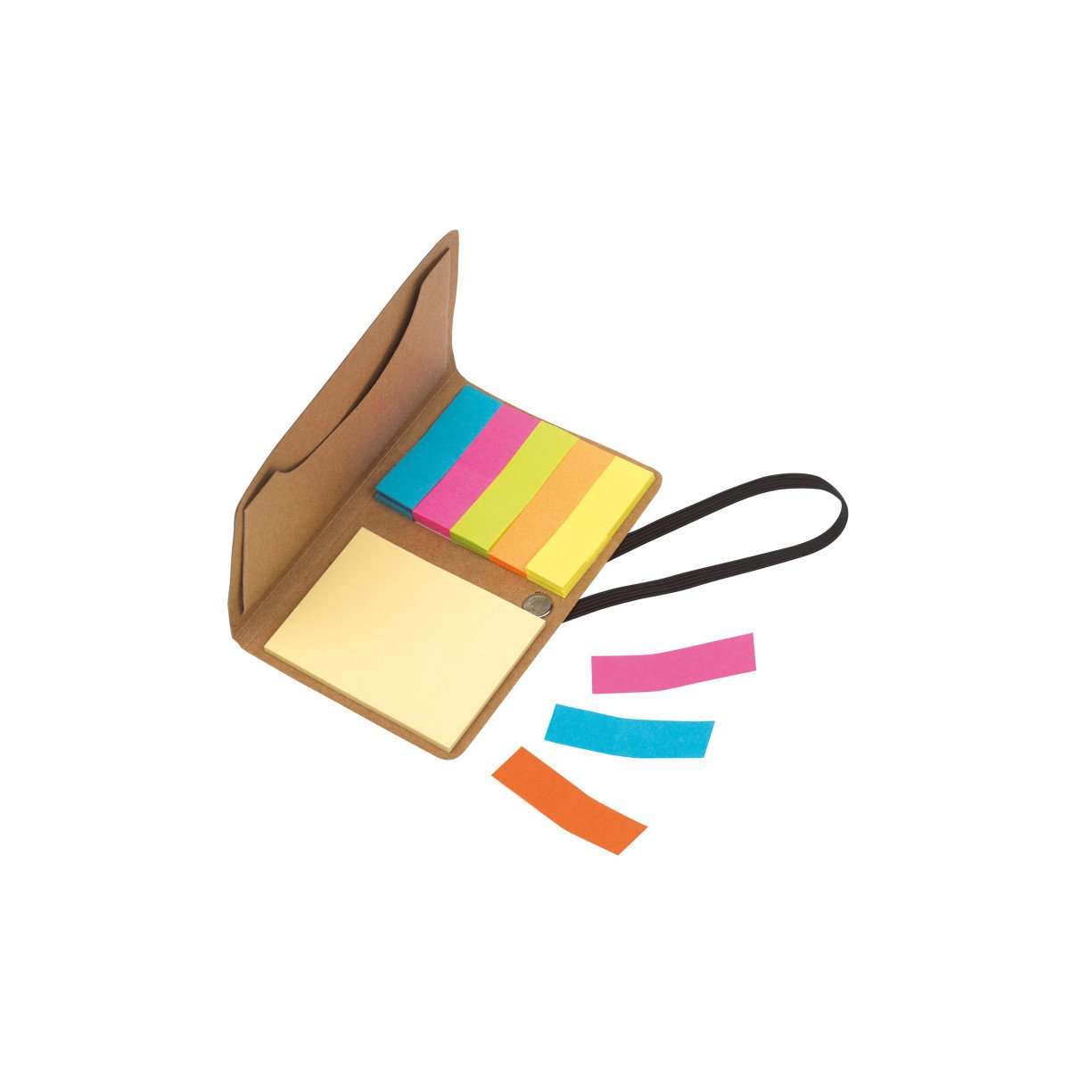 10,4 x 6,8 x 0,6 cm. Cartón. Material reciclado. 1 bloc autoadhesivo rectangular grande. 5 blocs autoadhesivos rectangulares chicos. Bolsillo interno. Cierre con banda elástica