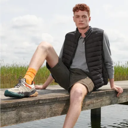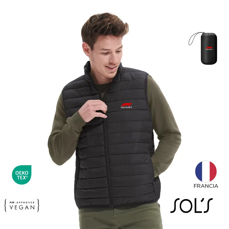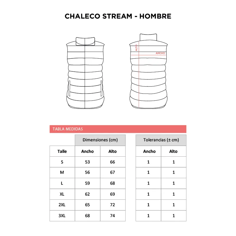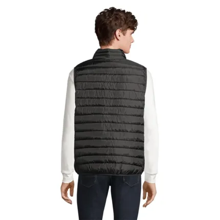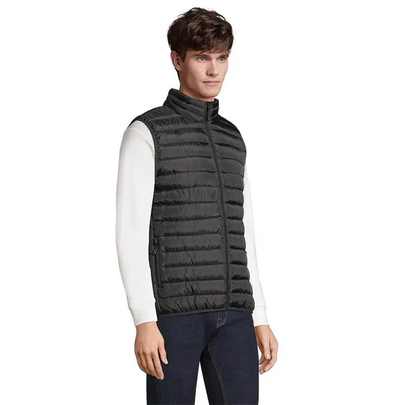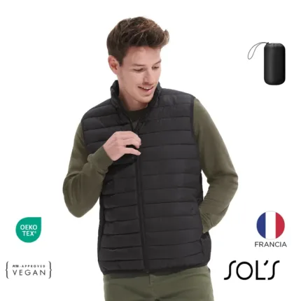 Chaleco ligero para hombre confeccionado en tafetán 280T. El tejido exterior y forro están fabricados 100% en poliéster, con relleno tipo plumón 100% poliéster. Cuenta con abertura y bolsillos laterales con cierre de nylon, cursor de metal con tirador de fantasía negro, cuello alto y terminaciones elásticas en la parte inferior y en las sisas para un mejor ajuste. Incluye bolsa para guardar la prenda. Es ideal para uso urbano, actividades al aire libre en climas frescos y como abrigo liviano para media estación.