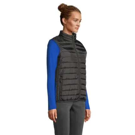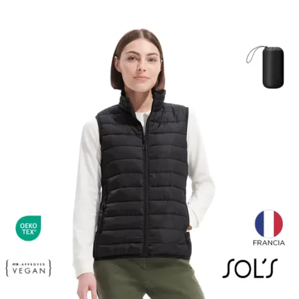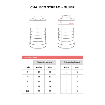 Chaleco ligero para mujer confeccionado en tafetán 280T. El tejido exterior y forro están fabricados 100% en poliéster, con relleno tipo plumón 100% poliéster. Cuenta con abertura y bolsillos laterales con cierre de nylon, cursor de metal con tirador de fantasía negro, cuello alto y terminaciones elásticas en la parte inferior y en las sisas para un mejor ajuste. Incluye bolsa para guardar la prenda. Es ideal para uso urbano, actividades al aire libre en climas frescos y como abrigo liviano para media estación.