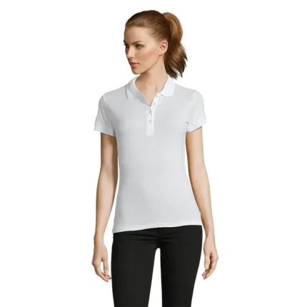 Chomba de pique con cuello de manga corta de 170g, 100% algodón peinado. Corte ajustado, cuello con tapa costura, aberturas laterales, cartera con 4 botones a tono y uno de repuesto