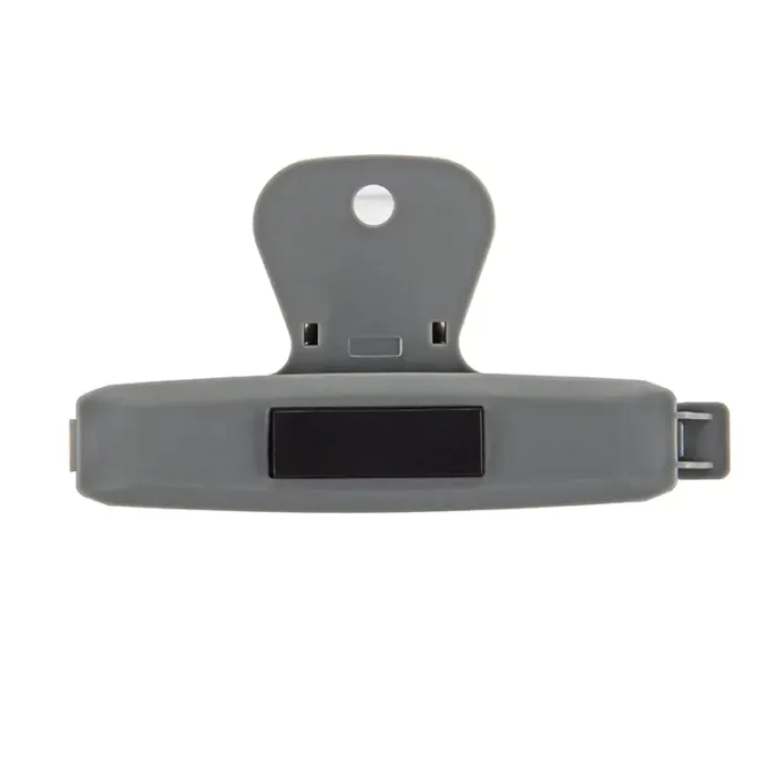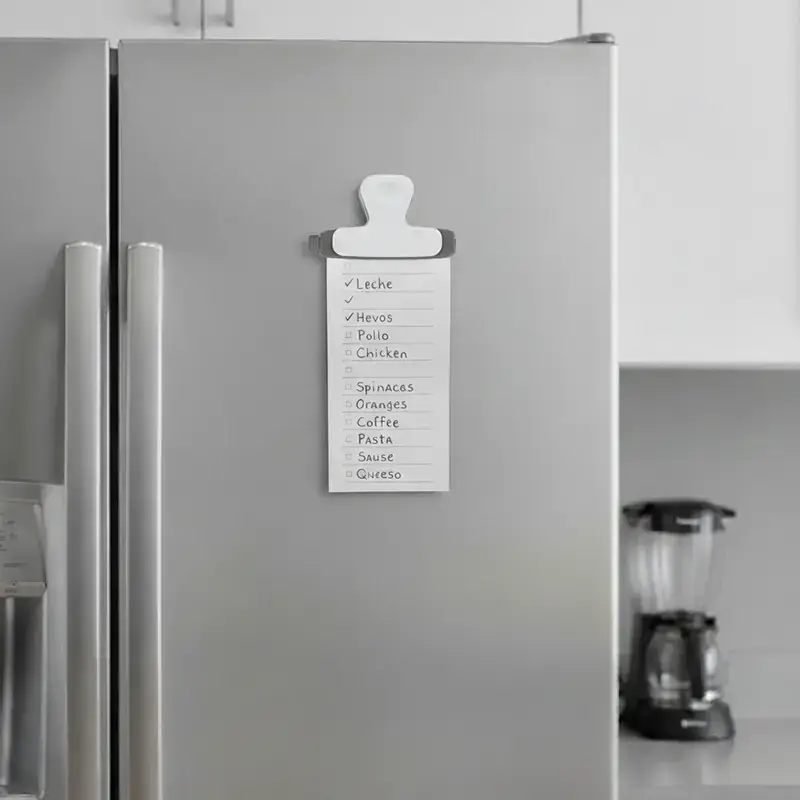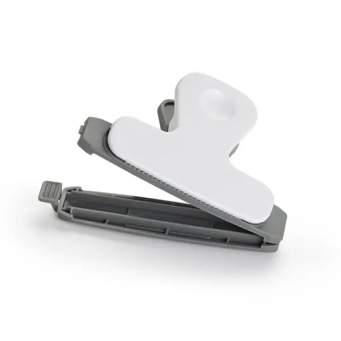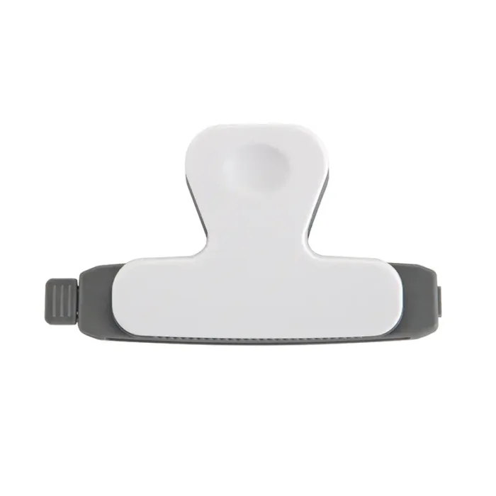Clip magnético blanco y gris. Hecho de poliestireno (PS) y magneto. Cuenta con diseño ergonómico con imán trasero, pinza de agarre firme y superficie plana con detalles en gris. Es ideal para sujetar papeles, cerrar bolsas o adherirse al refrigerador para dejar recordatorios o notas.