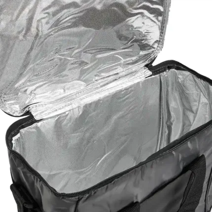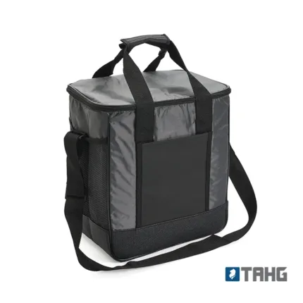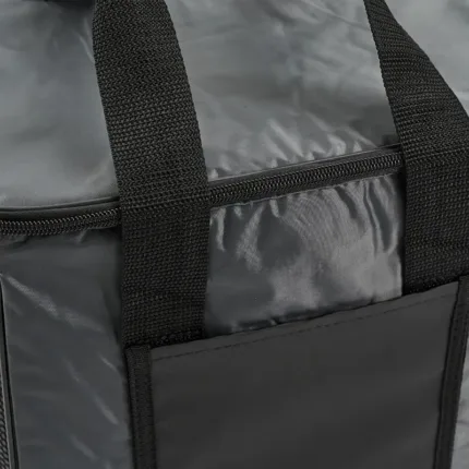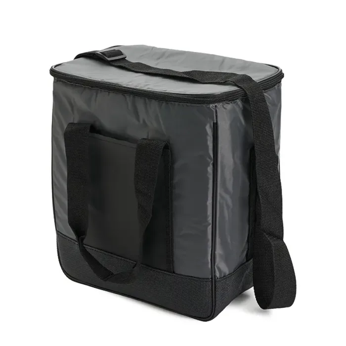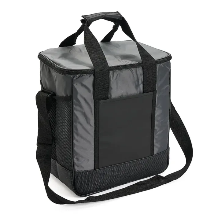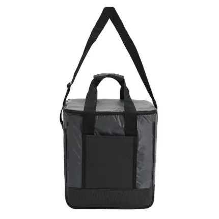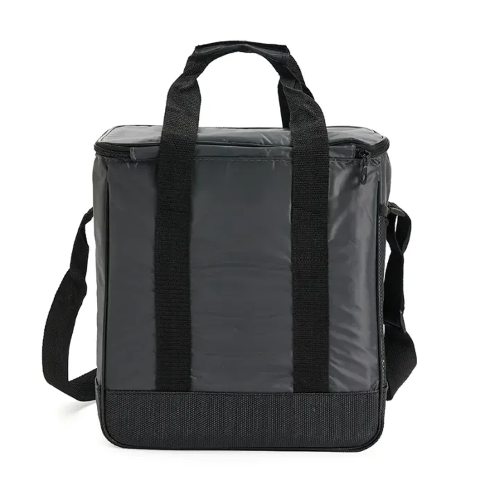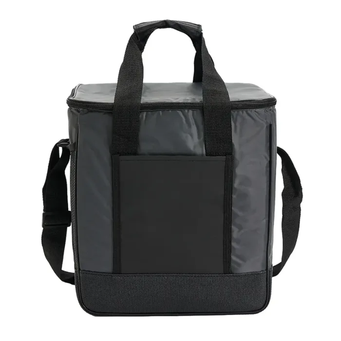 Cooler con doble asa y correa regulable. Está confeccionado en tela 70D, con interior de aluminio y espuma PE. Cuenta con compartimiento principal con cierre, bolsillo frontal y dos asas superiores reforzadas. Es ideal para conservar alimentos y bebidas en salidas o traslados.