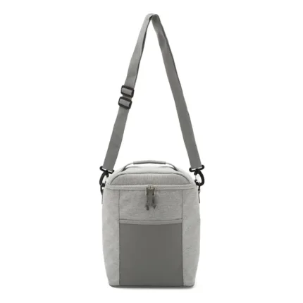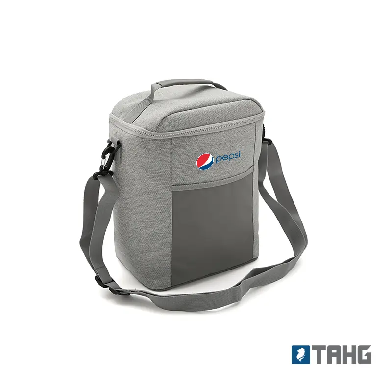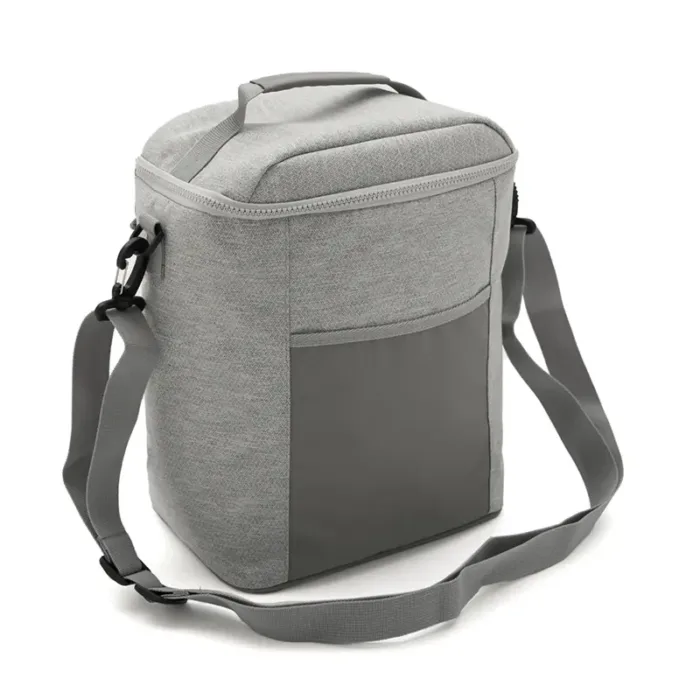 Cooler rectangular con bolsillo frontal y correa lateral. Confeccionado en poliéster, con interior de PEVA + PE. Cuenta con compartimiento principal con cierre, correa ajustable y manija superior. Es ideal para transportar alimentos y bebidas en salidas o uso diario.