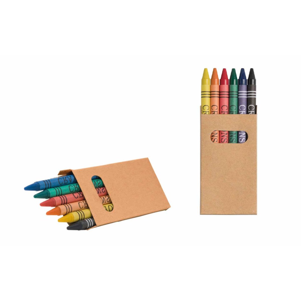 Crayones de cera en 6 colores: amarillo, naranja, rojo, verde, azul y negro en caja de cartón con ventana. Ideal para dibujar o para trabajos escolares. Recubiertos en papel para mejorar el agarre. Fáciles de sacar punta. No tóxicos. Medidas: ø0,85 x 9 cm Medidas de la caja: 5,3 x 9 x 0,9 cm