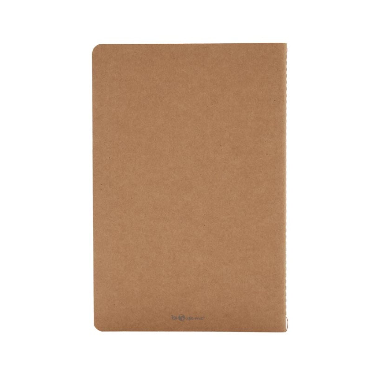 Cuaderno A5 de 40 hojas lisas de 70gr con tapa blanda fabricada en cartón duro. Encuadernación cosida. Medidas: 21 x14 cm (Altura x Ancho). ReUseMe.