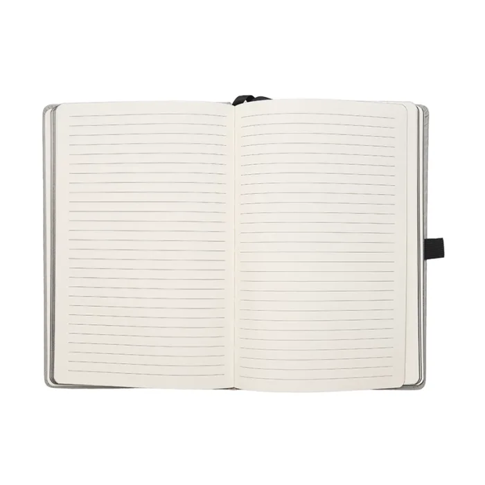 Cuaderno con tapa dura confeccionada en PU (poliuretano) color gris. Cuenta con 96 hojas rayadas de 70 g, perfectas para tomar notas, escribir ideas o planificar la jornada e incluye cinta señaladora.