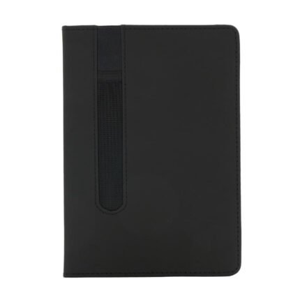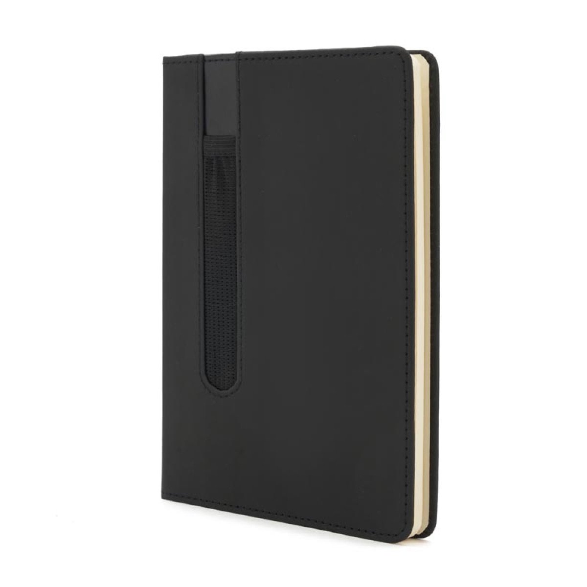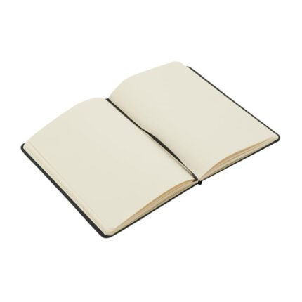 Cuaderno de 80 hojas lisas de 70 gr con tapa dura de cartón reciclado recubierto de PU. Cuenta con marcador de páginas color negro y, su tapa posee elástico porta lapicera. Encuadernación cosida.