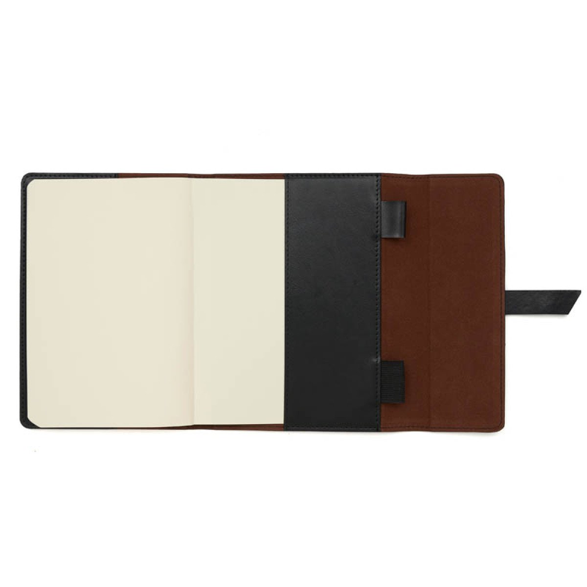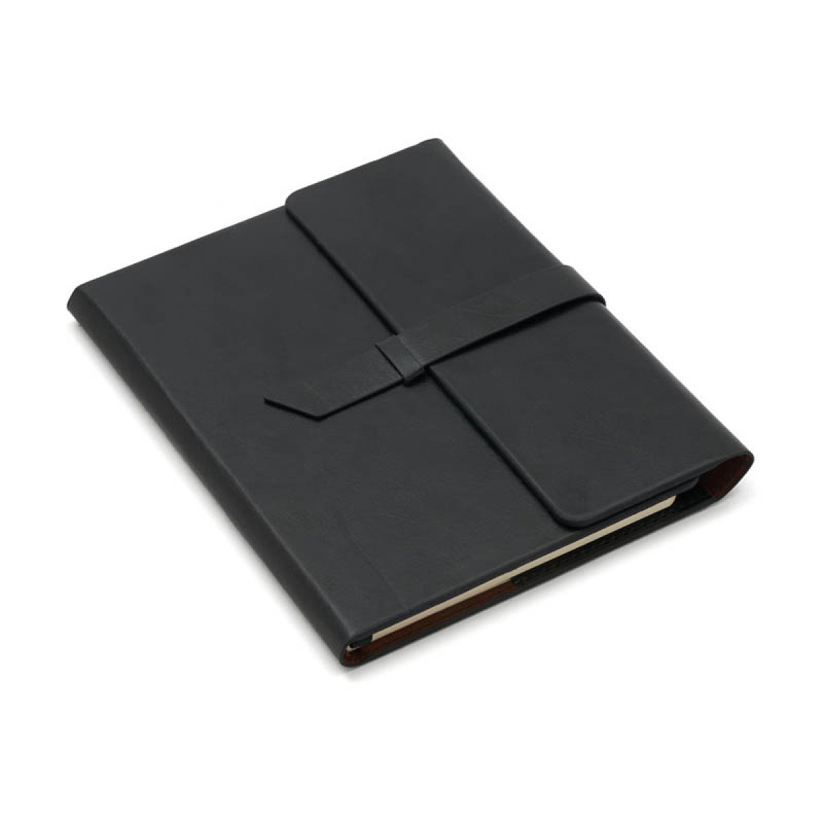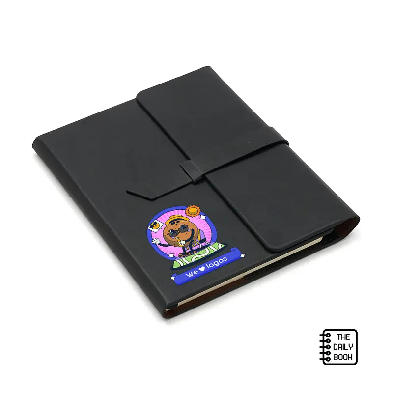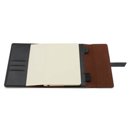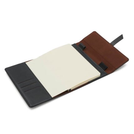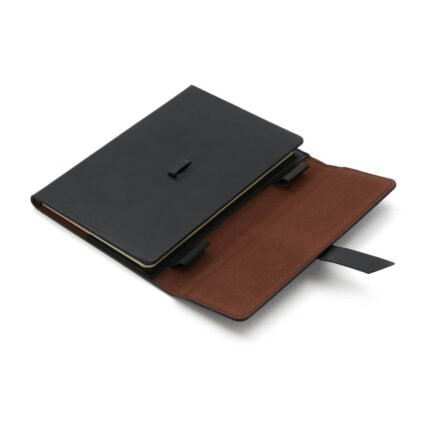 Cuenta con cinta señaladora color negro, bolsillos interiores para guardar tarjetas y porta lapicera. Cierre con solapas y cinta de simil cuero.