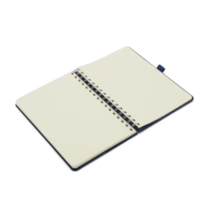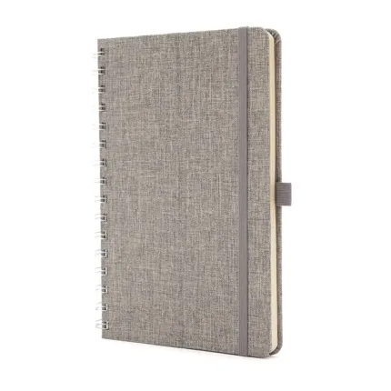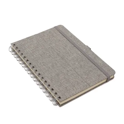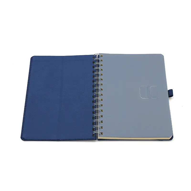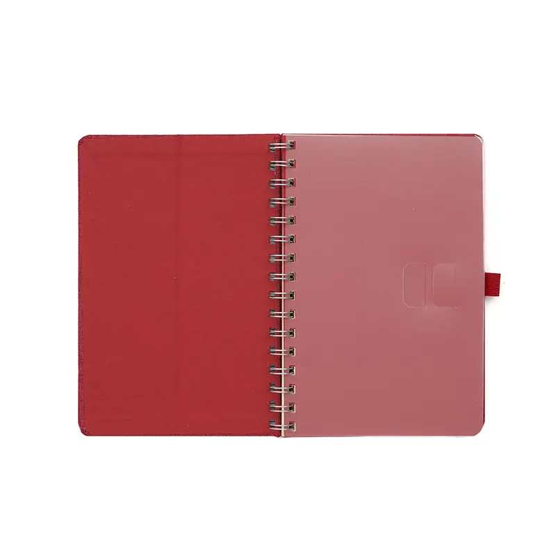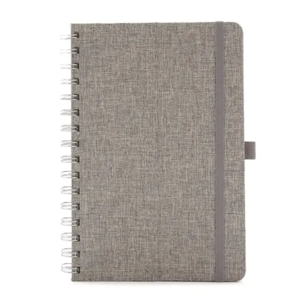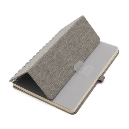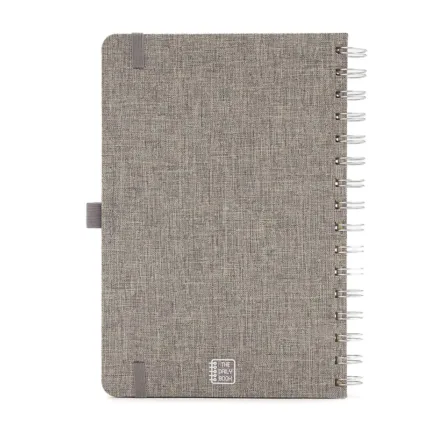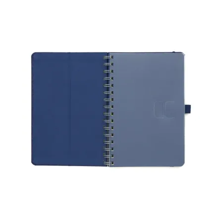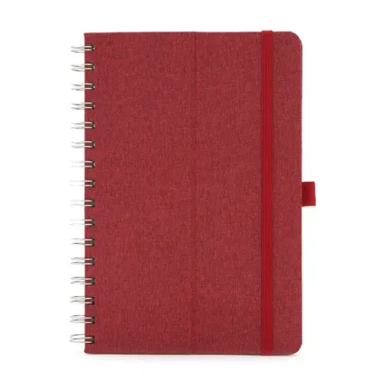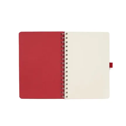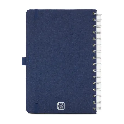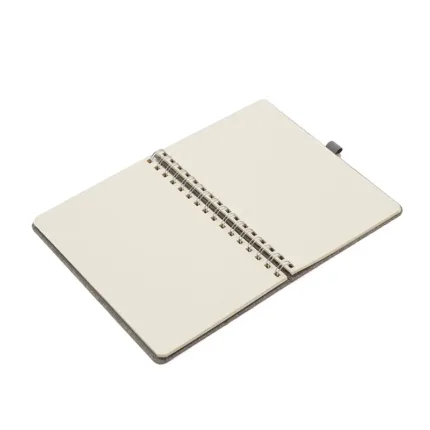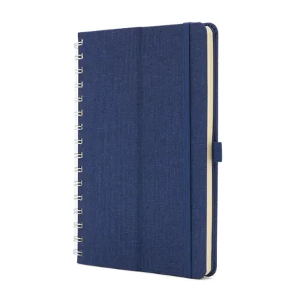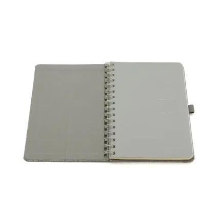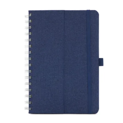 Cuaderno anillado de 80 hojas lisas de 70gr. Tapa dura confeccionada en RPET, material hecho con botellas de plástico recicladas. Su tapa delantera puede doblarse, creando un soporte para teléfono. Cuenta con cierre elástico y porta lapicera.