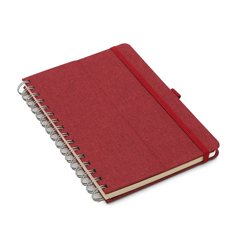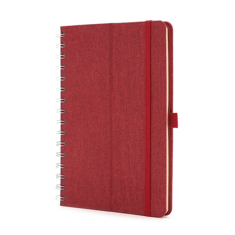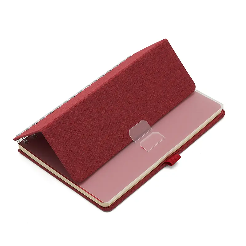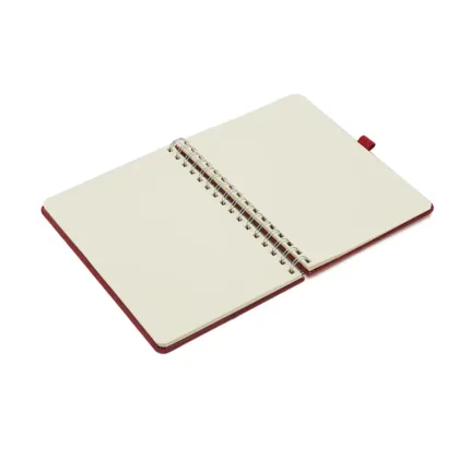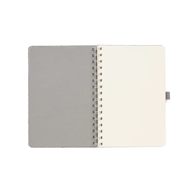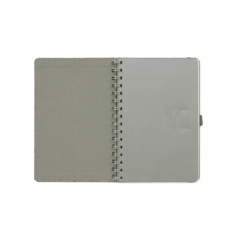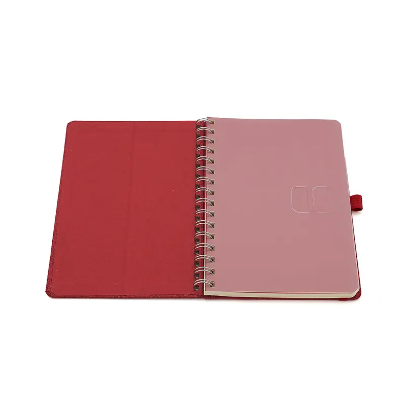 Cuaderno anillado de 80 hojas lisas de 70gr. Tapa dura confeccionada en RPET, material hecho con botellas de plástico recicladas. Su tapa delantera puede doblarse, creando un soporte para teléfono. Cuenta con cierre elástico y porta lapicera.