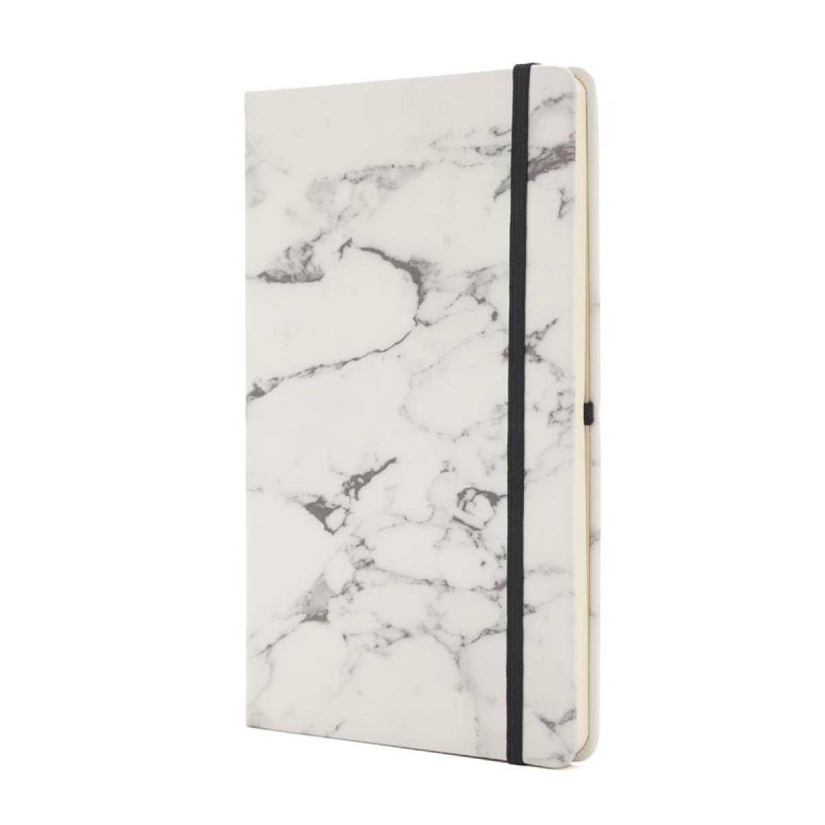 Cuaderno A5 con 80 hojas lisas de 70gr de tapa dura de PU con estampa simil mármol. Cuenta con cierre elástico y marcador de páginas color negro. Encuadernación cosida.