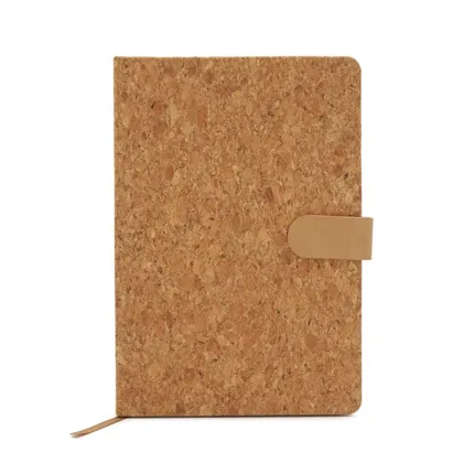 Cuaderno A5 con tapa dura hecho de corcho reciclado fabricado en corcho reciclado y cierre magnético de PU a tono cuenta con 96 hojas rayadas de papel marfil de 70 gramos cinta señaladora y diseño ecológico es ideal para tomar notas en reuniones estudios o como regalo corporativo sustentable.