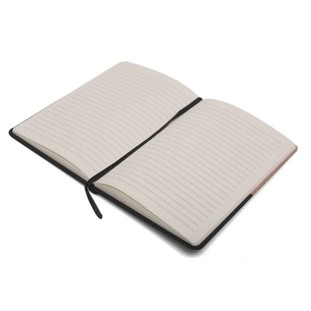 Cuaderno tapa dura forrado mitad en corcho y mitad en eco cuero soft mate.
