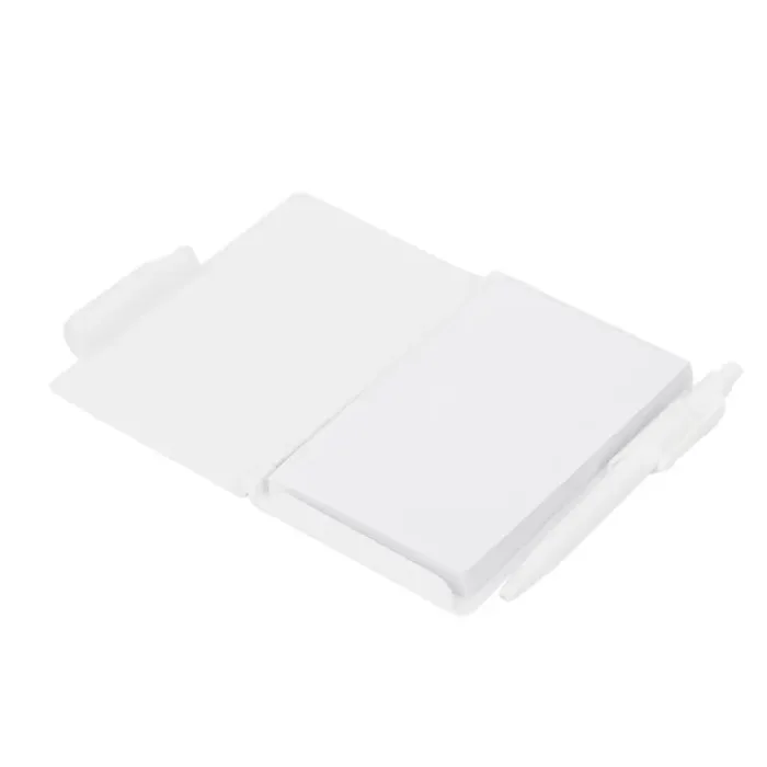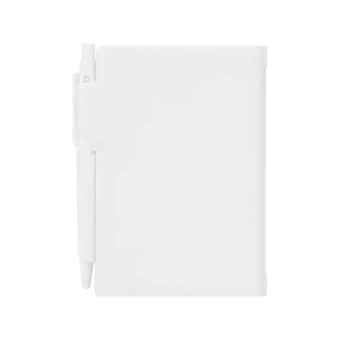 Cuaderno de bolsillo, con tapa dura plástica de PS y porta bolígrafo. 80 hojas lisas. Incluye bolígrafo. Medidas: 10,4 x 7,8 cm. Tahg