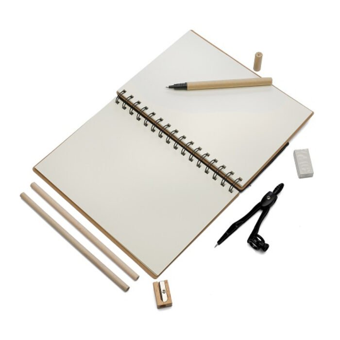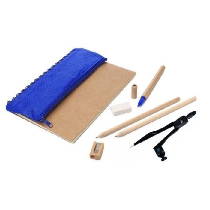 Incluye: 1 Bolígrafo Eco con capuchón, 2 lápices , 1 sacapuntas en madera, 1 goma de borrar, y 1 compas.