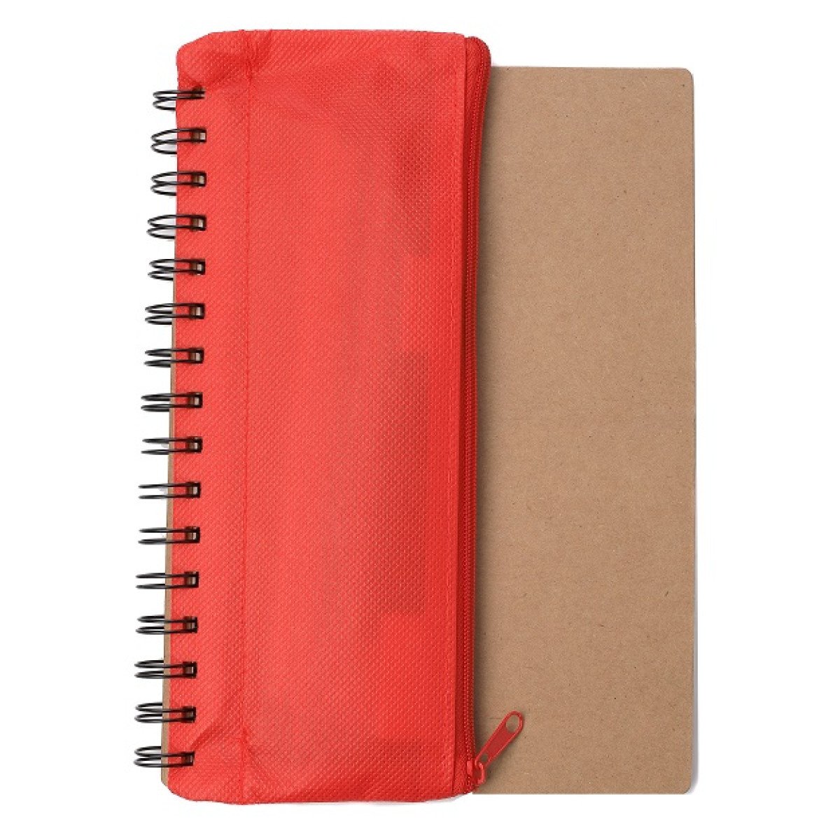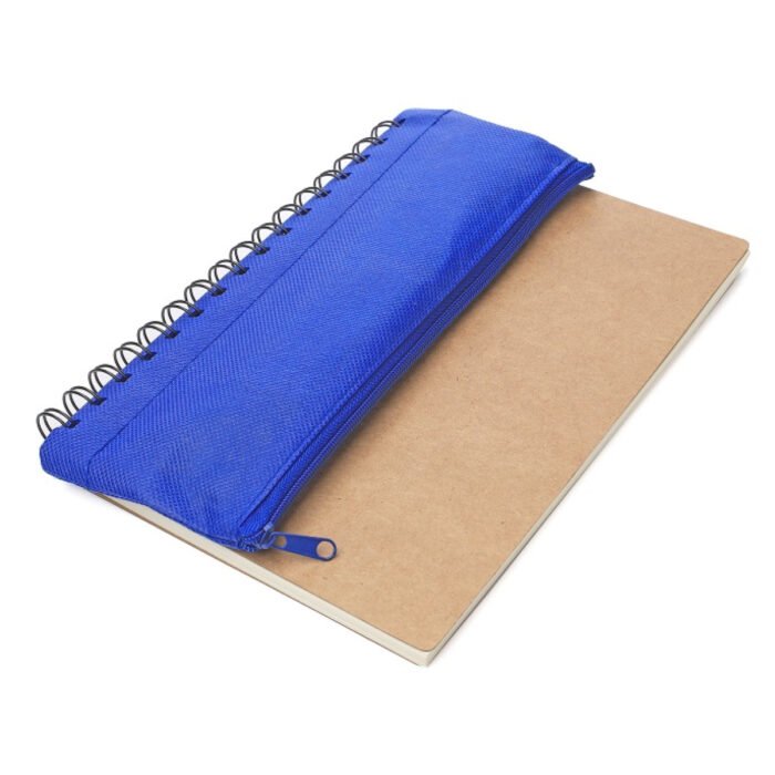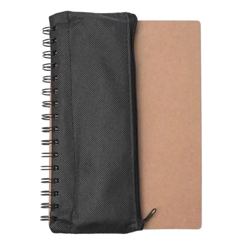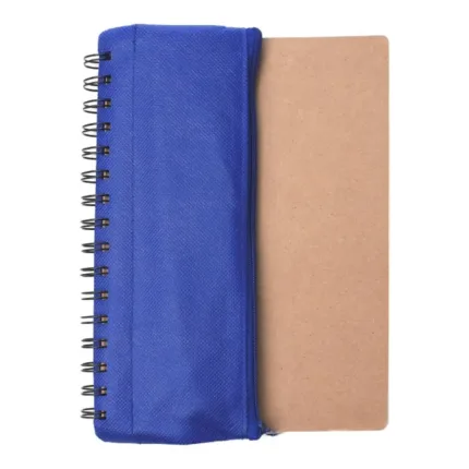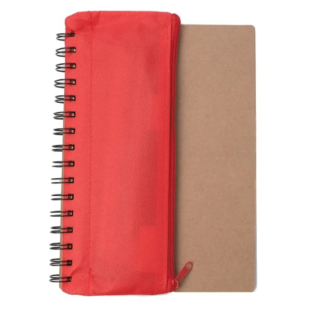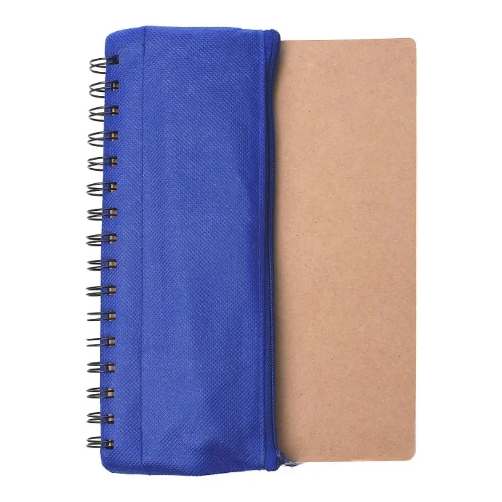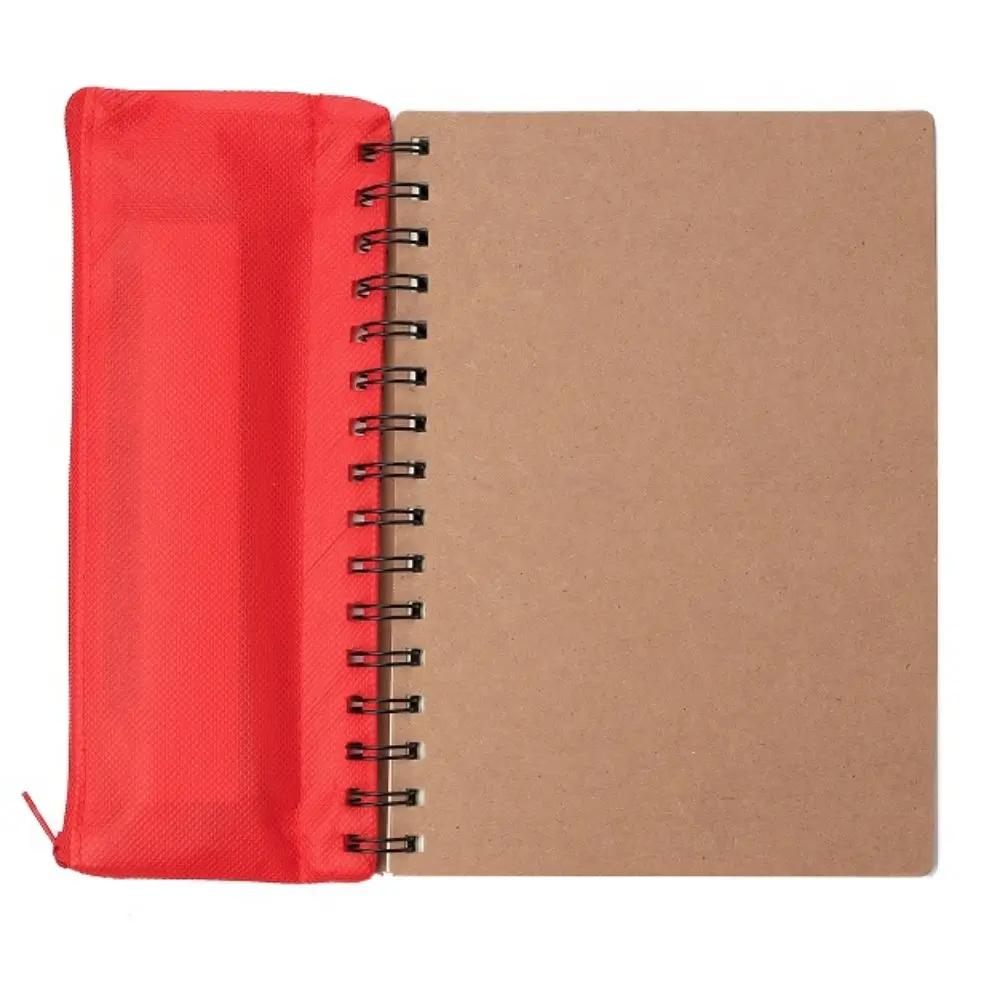 Cuaderno espiralado con cartuchera integrada de tela friselina no tejida, con cierre.