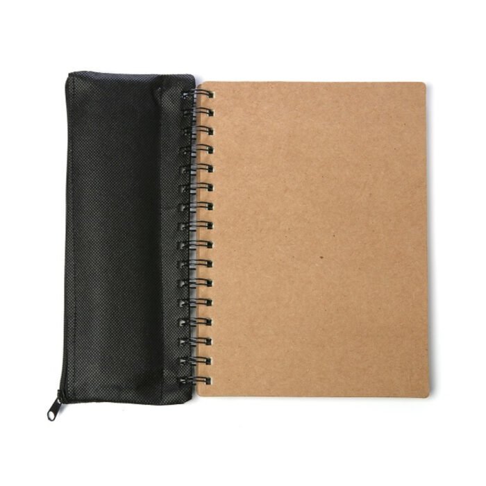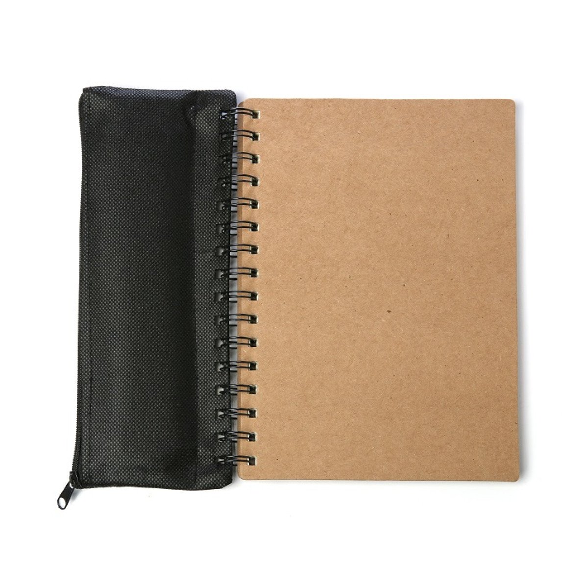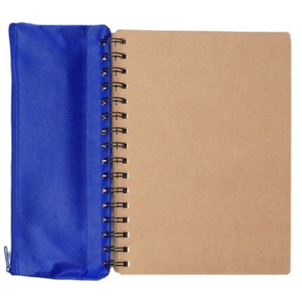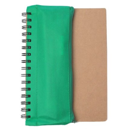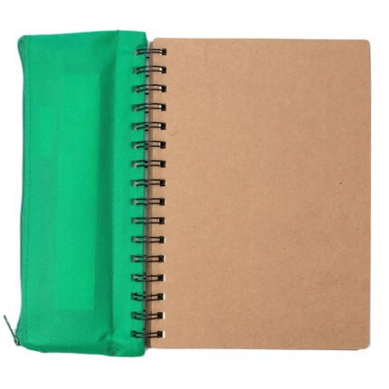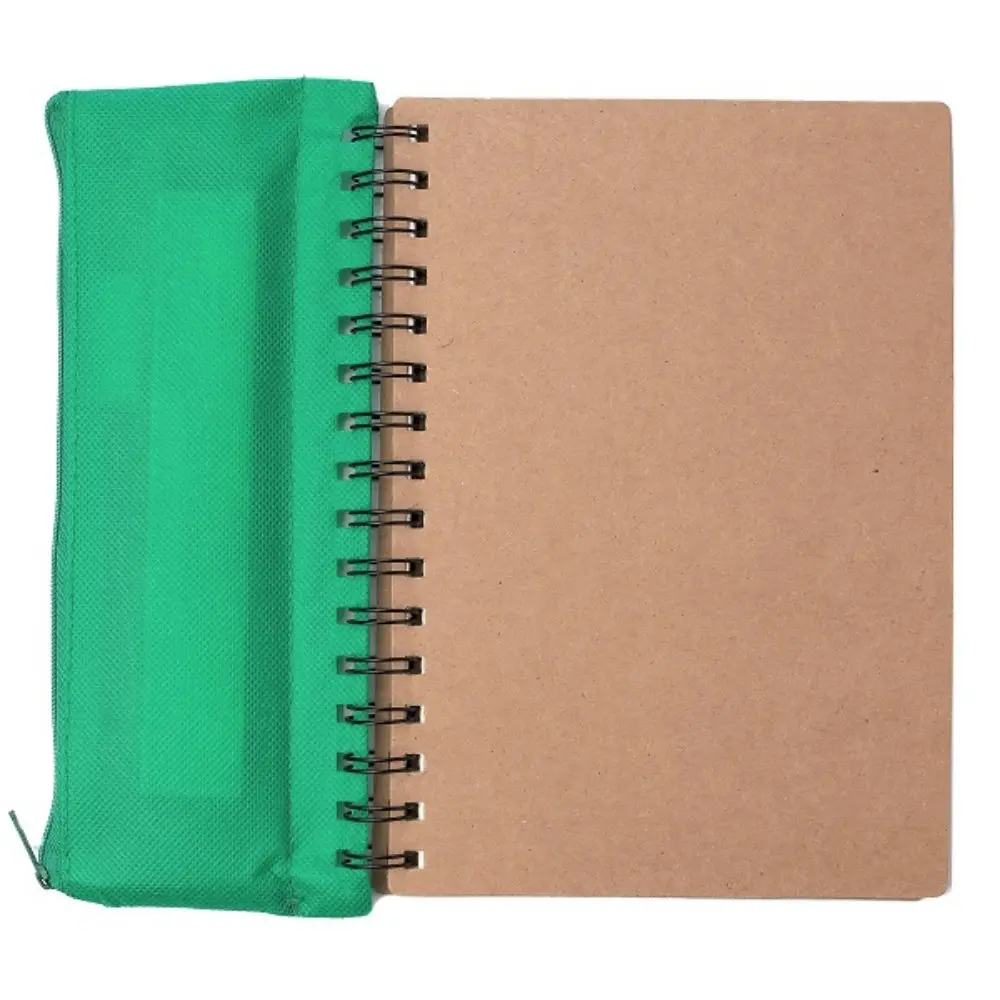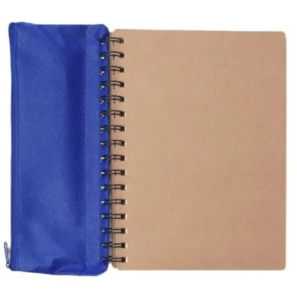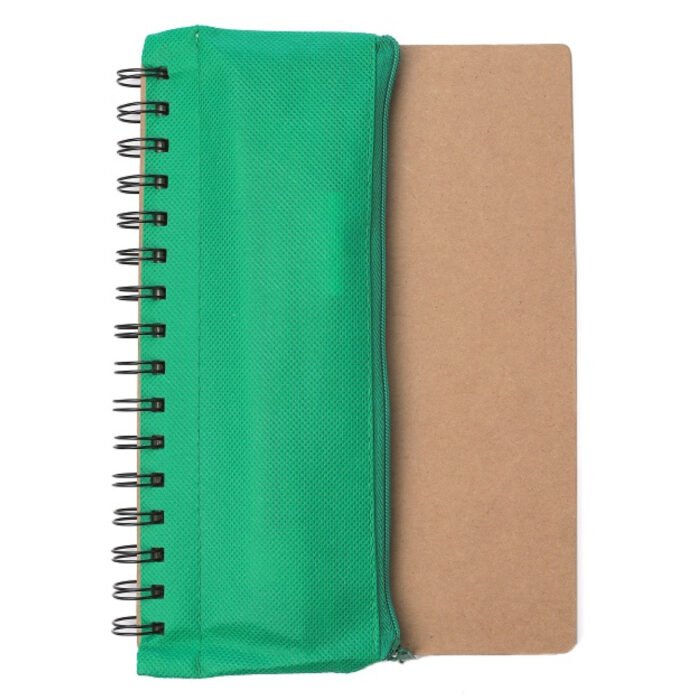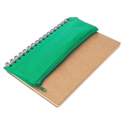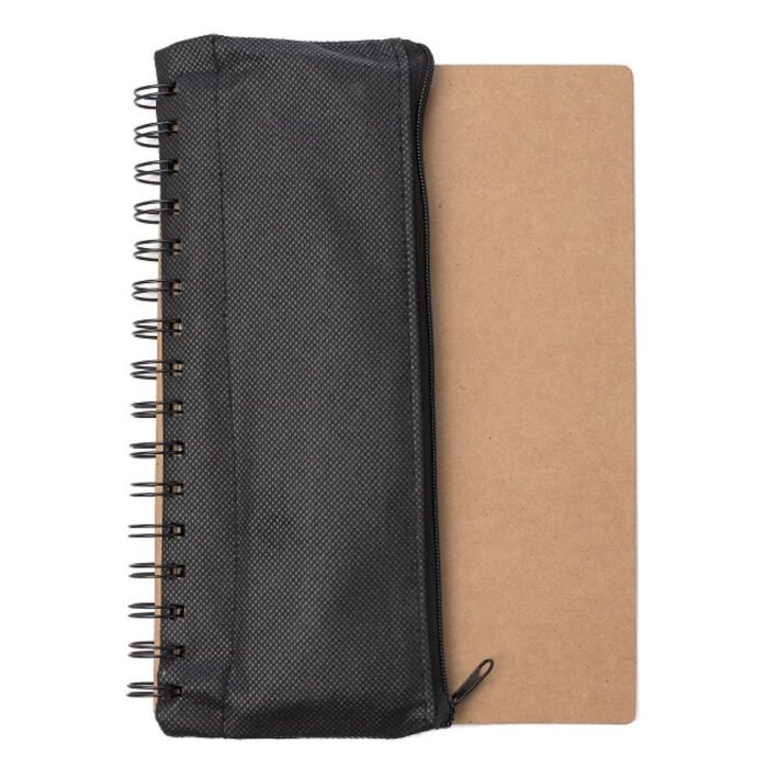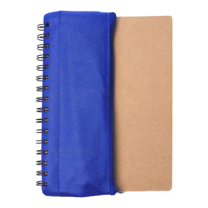 Cuaderno espiralado con cartuchera integrada de tela friselina no tejida, con cierre.