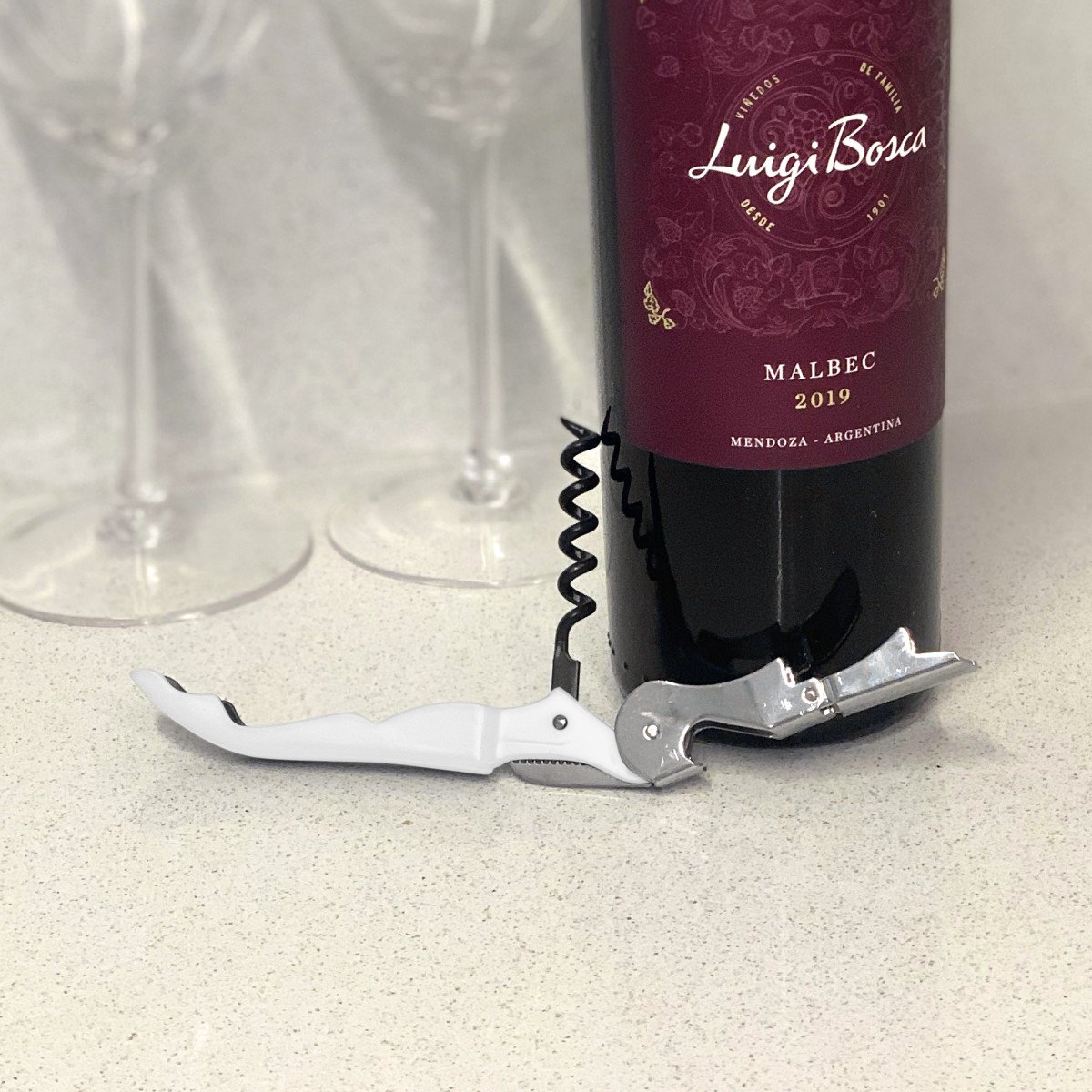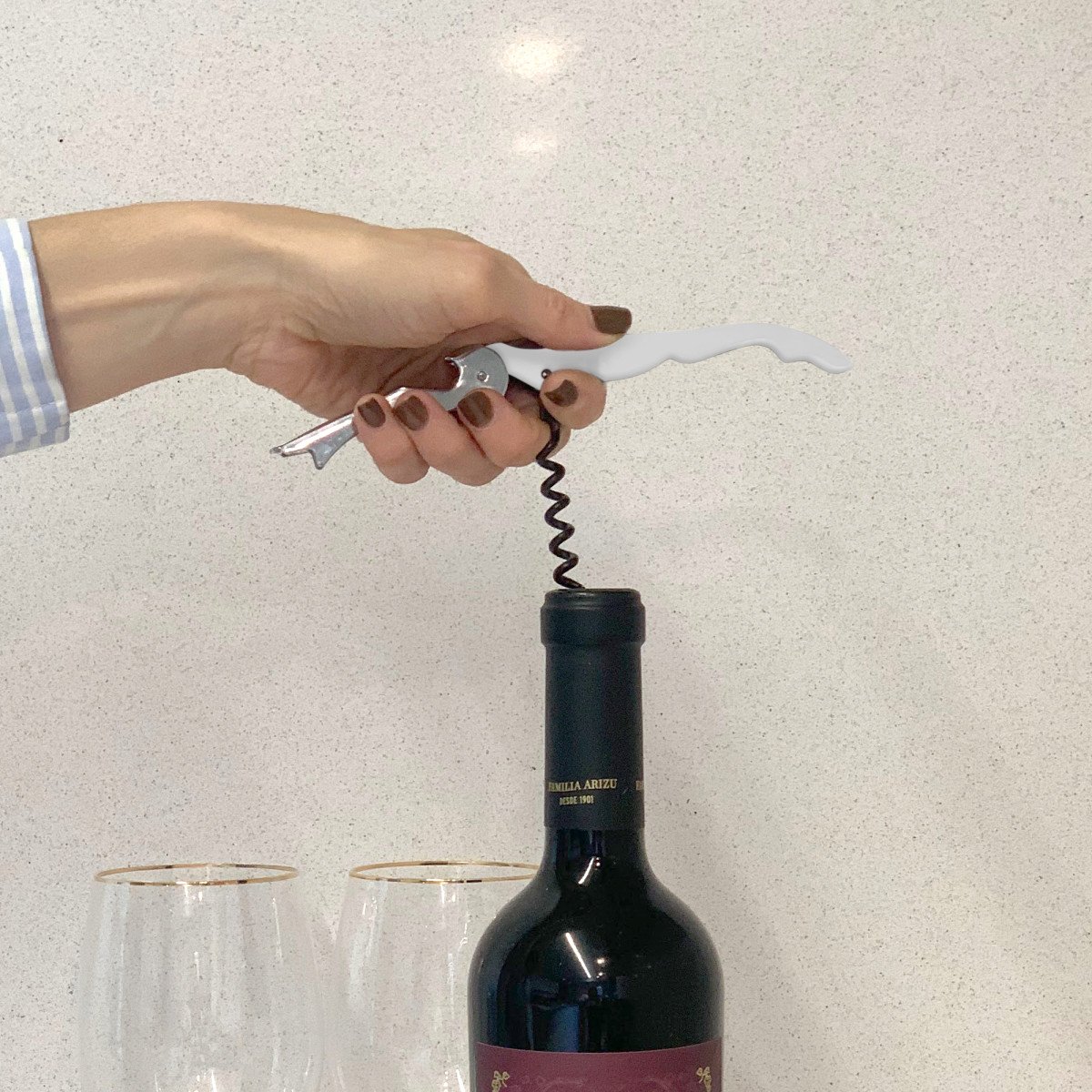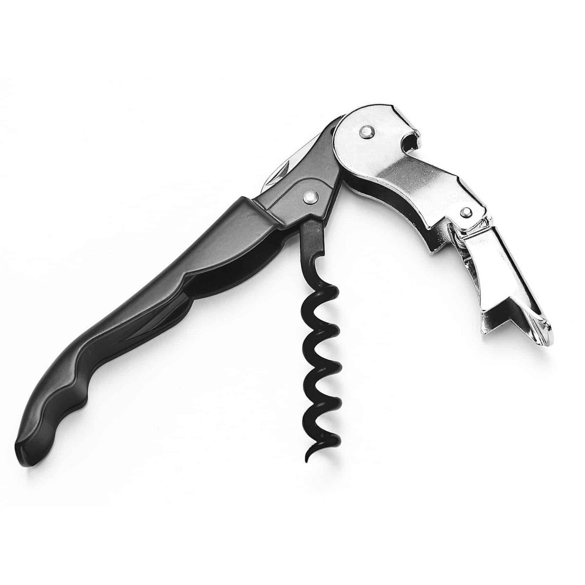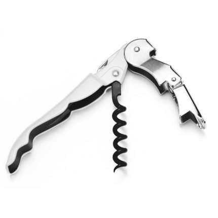 12,1 x 2 x 1 cm. Acero inoxidable 420. Peso: 52g. Destapador dos tiempos de vinos, pintura mate y detalles en color plata. Sierra afilada para sacar la cubierta o capsula de la botella. Presentación en caja de regalo.
