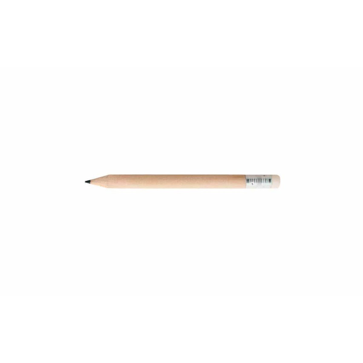 Mini lápiz ecológico de madera y grafito. Incluye en la parte superior una goma recubierta por una férula de metal. Tiene una graduación HB y se entrega con punta. Medidas : ø0,7 x 10 cm