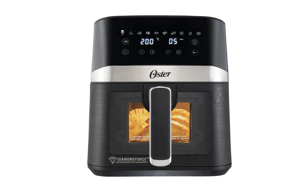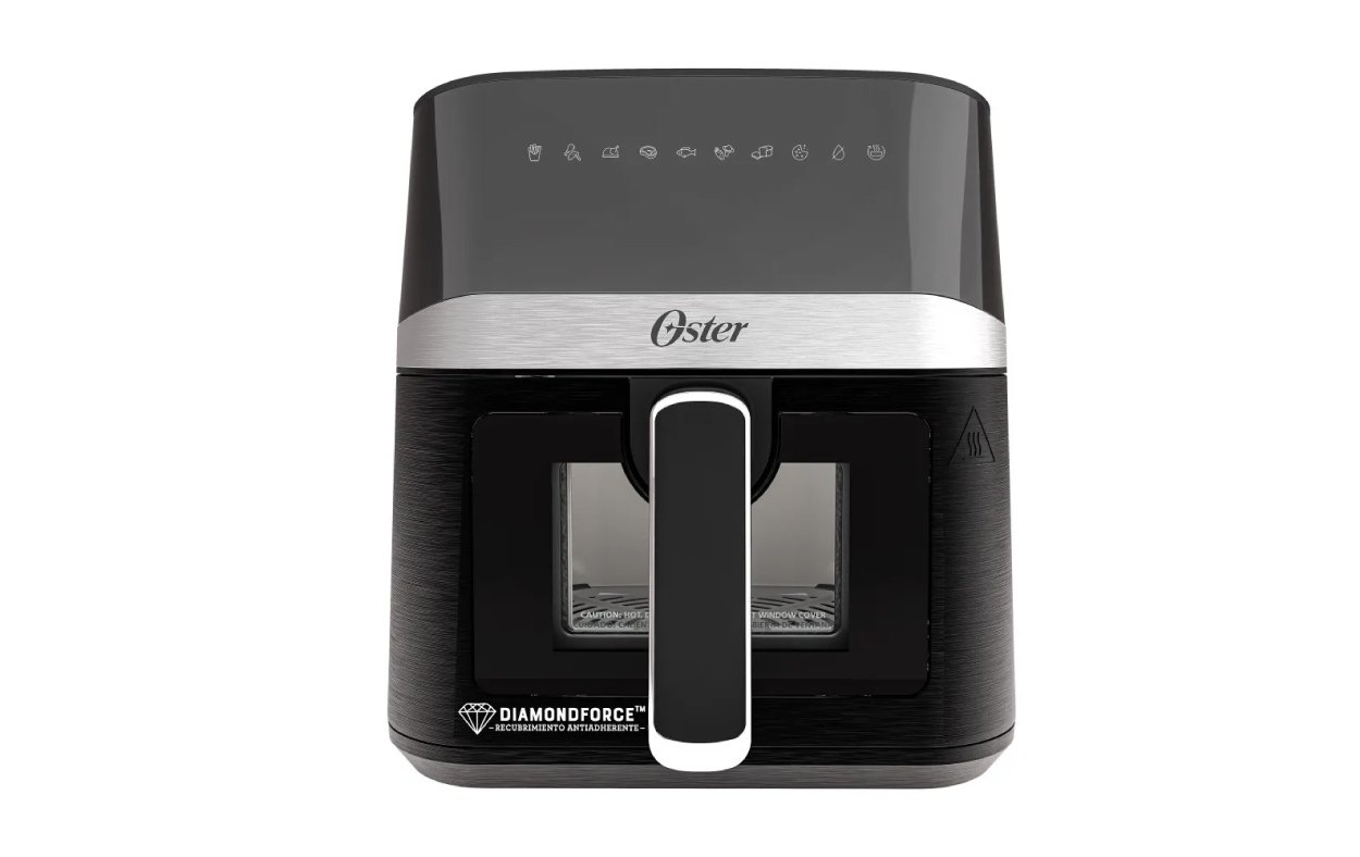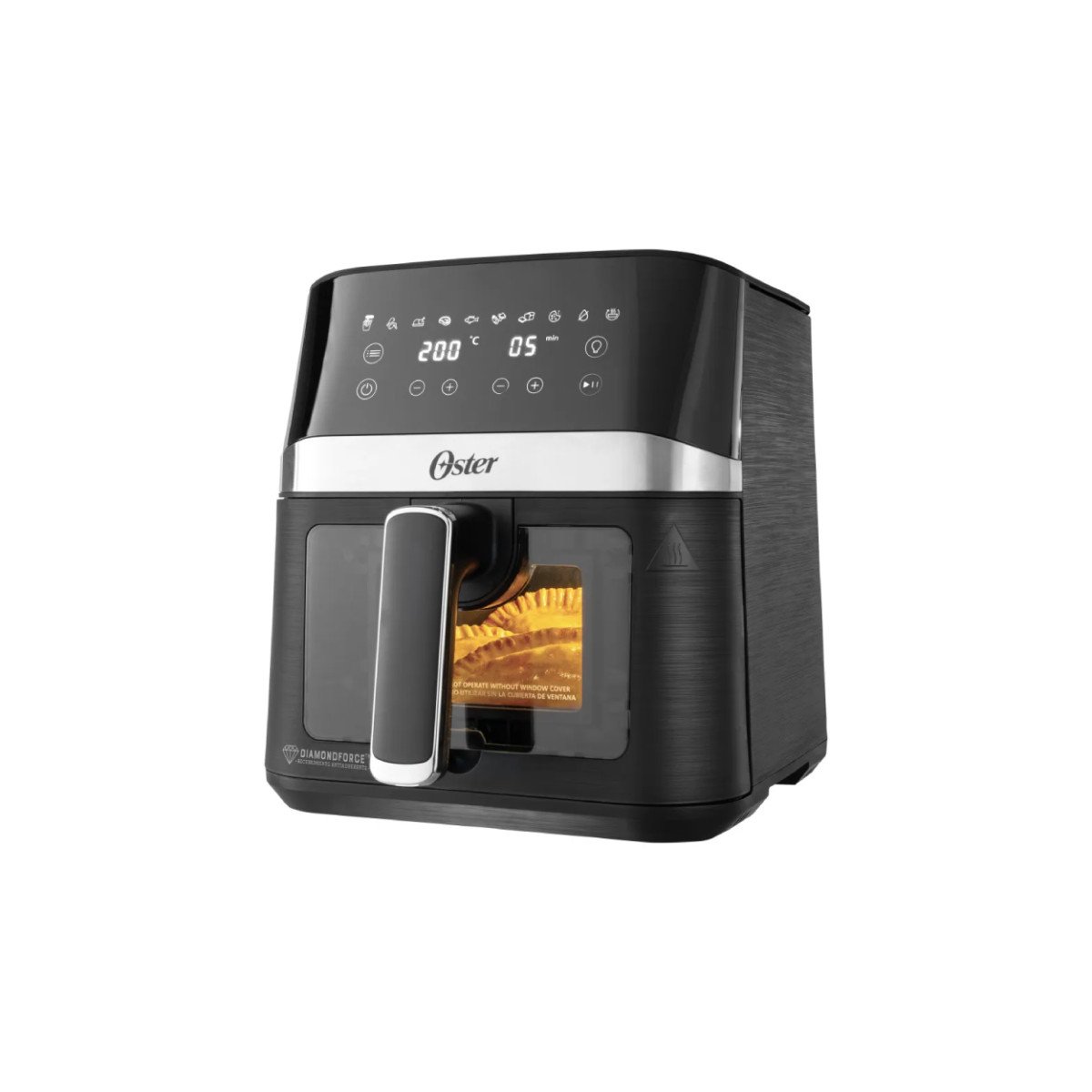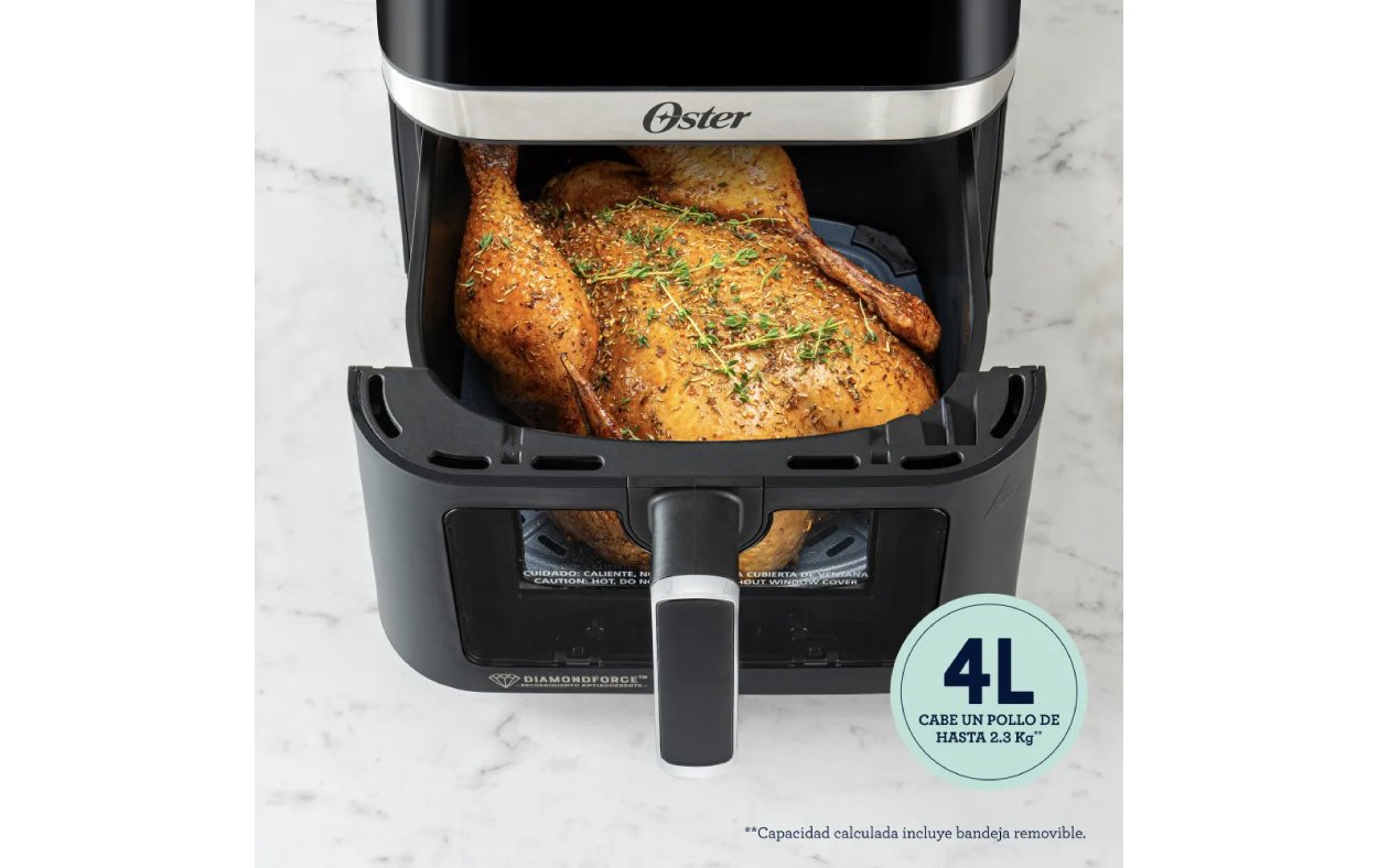 La freidora de aire digital Oster® DiamondForce de 4 L permite preparar comidas deliciosas y más saludables, logrando texturas crujientes con hasta 99 % menos aceite. Cuenta con 10 programas automáticos que facilitan la cocción de papas fritas, alitas, carnes, vegetales, pescado, horneados, postres y más, con solo presionar un botón. Su ventana transparente con luz interior permite controlar la cocción sin abrir la cesta, manteniendo la temperatura constante. Además, el recubrimiento DiamondForce la hace más resistente a rayaduras y mucho más fácil de limpiar, ideal para el uso diario en la cocina.
