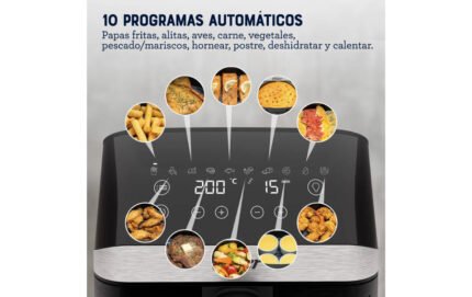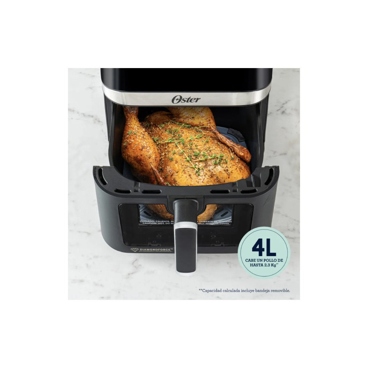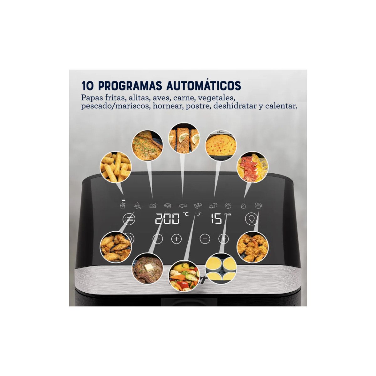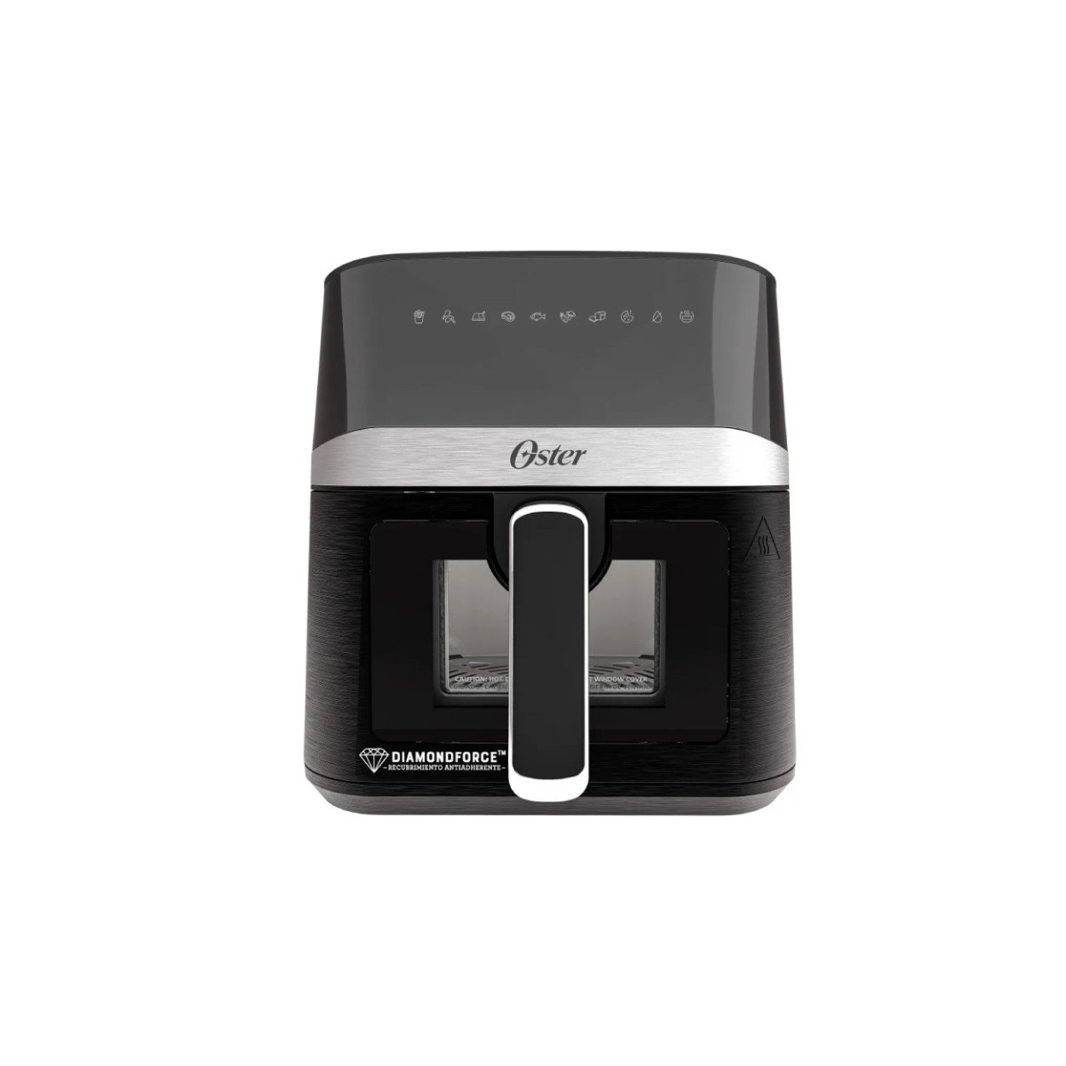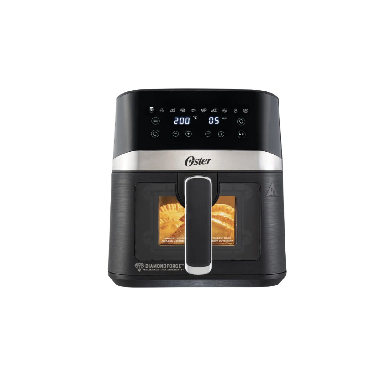 La freidora de aire digital Oster® DiamondForce de 4 L permite preparar comidas deliciosas y más saludables, logrando texturas crujientes con hasta 99 % menos aceite. Cuenta con 10 programas automáticos que facilitan la cocción de papas fritas, alitas, carnes, vegetales, pescado, horneados, postres y más, con solo presionar un botón. Su ventana transparente con luz interior permite controlar la cocción sin abrir la cesta, manteniendo la temperatura constante. Además, el recubrimiento DiamondForce la hace más resistente a rayaduras y mucho más fácil de limpiar, ideal para el uso diario en la cocina.