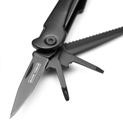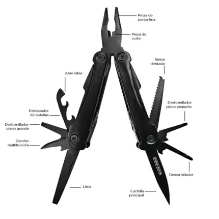Multi Herramienta de acero inoxidable y aluminio con 13 funciones. Incluye funda negra. Medidas Multitool: 2.2 x 4.5 x 10.5 cm. Medidas Packaging: 4.3 x 14.3 x 15.5 cm. Suns Tools.