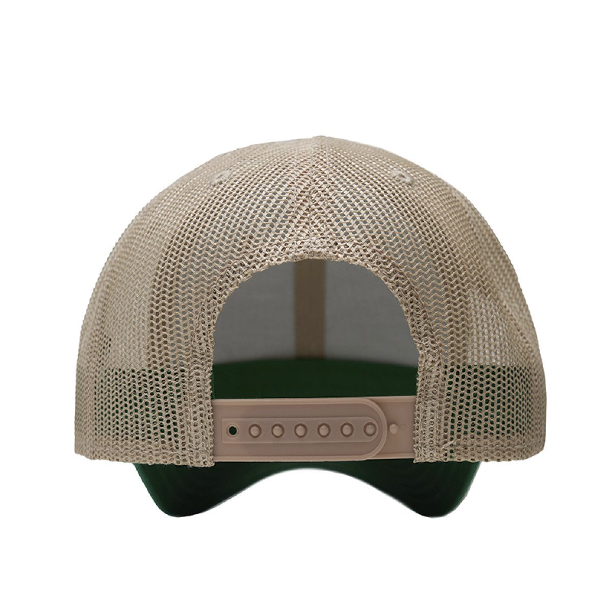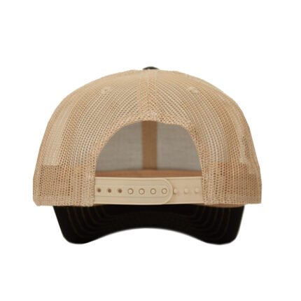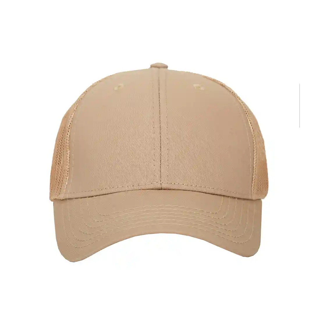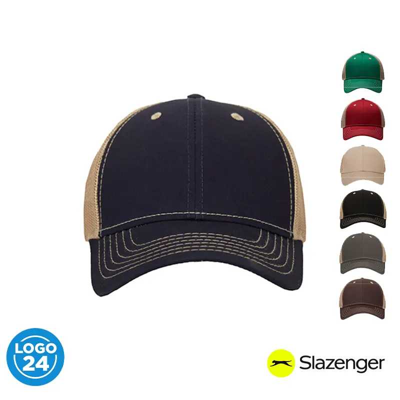 Gorro de 6 gajos con visera. El dorso del del gorro cuenta con diseño de tela de red de color kaki y ajuste con broche. Posee un sticker metalizado en la visera. Slazenger.