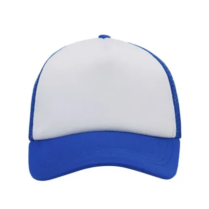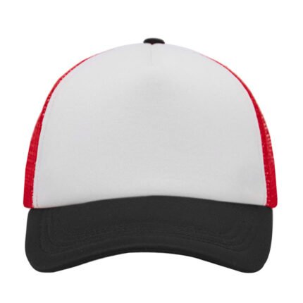 Gorro de 5 paneles en Polyester. Parte trasera con tela red de color. Ajuste con broche plástico.