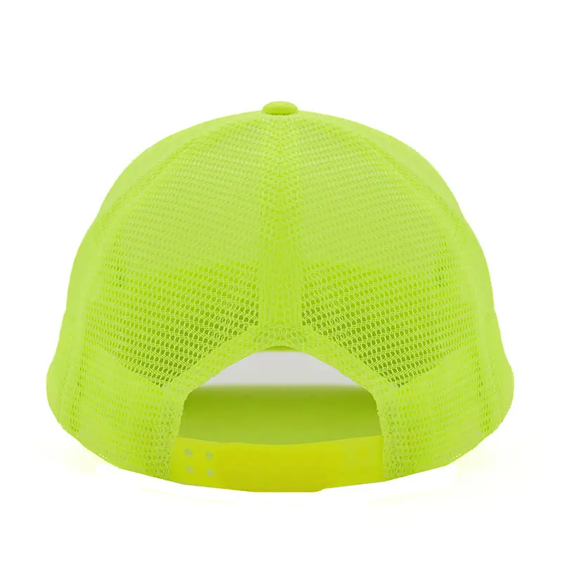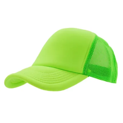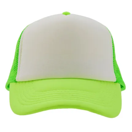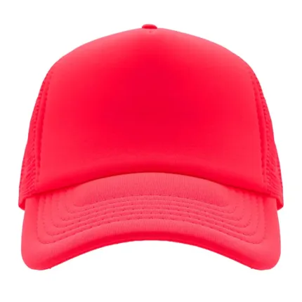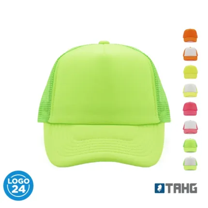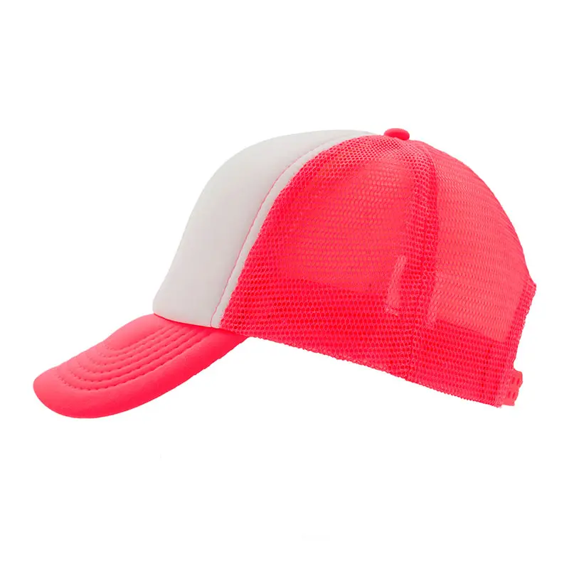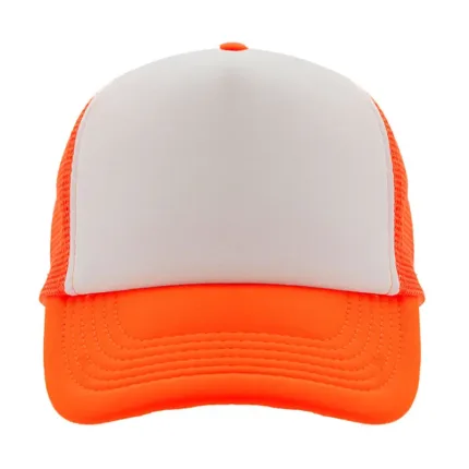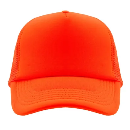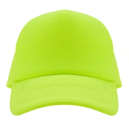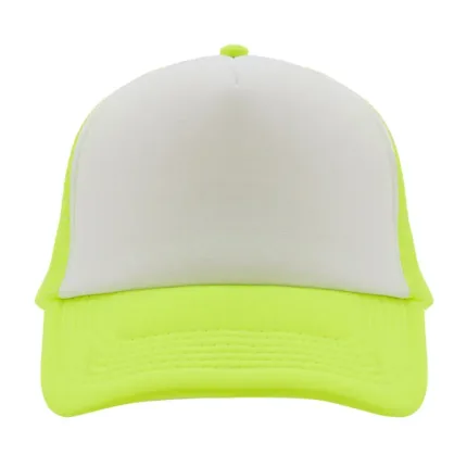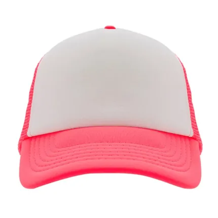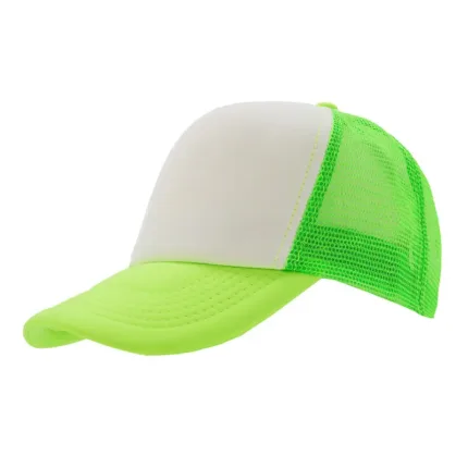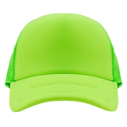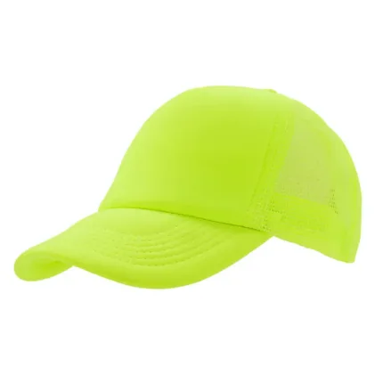 Gorro de 5 paneles en poliéster con parte trasera de tela de red. Disponible en colores fluorescentes: rosa, verde, amarillo, naranja y combinaciones de estos con blanco. Ajuste con broche plástico.