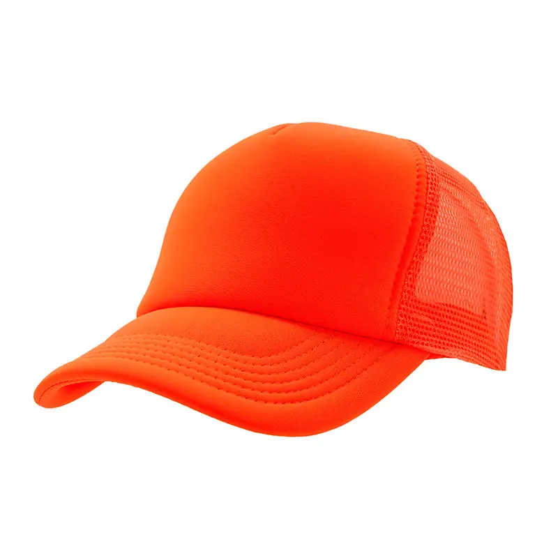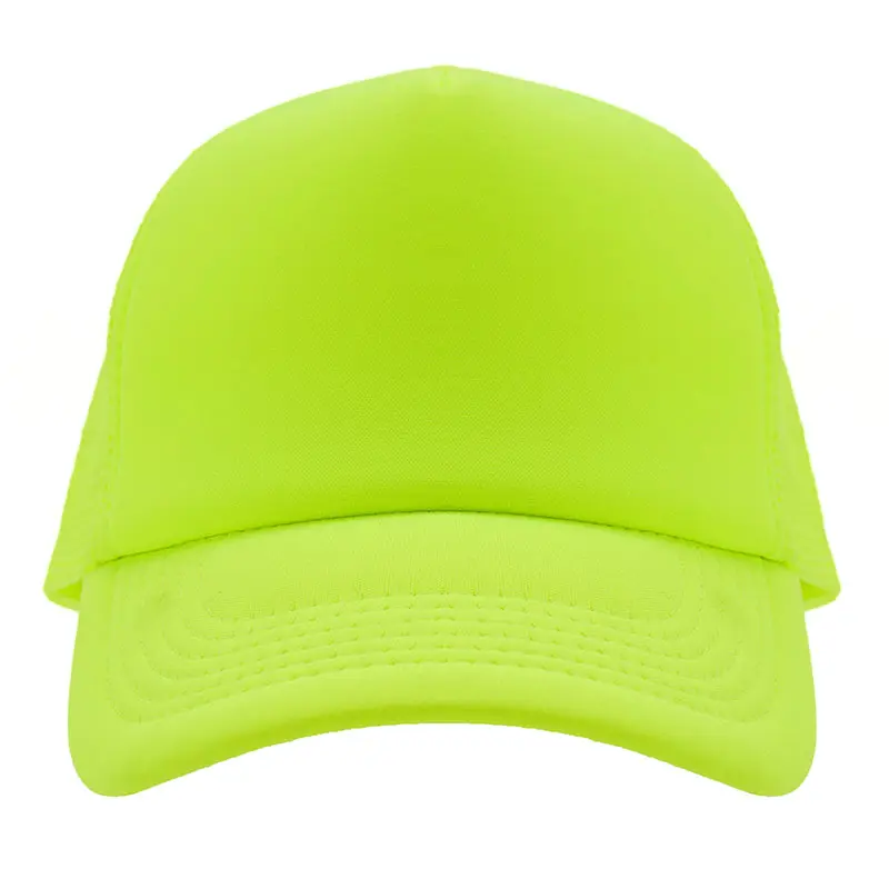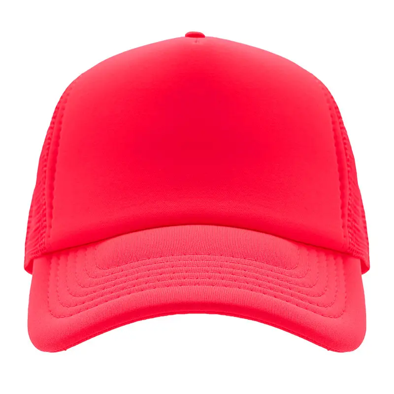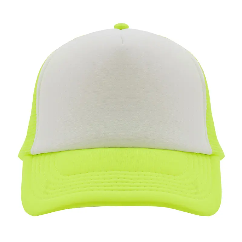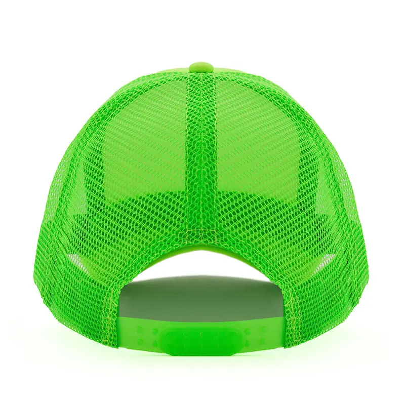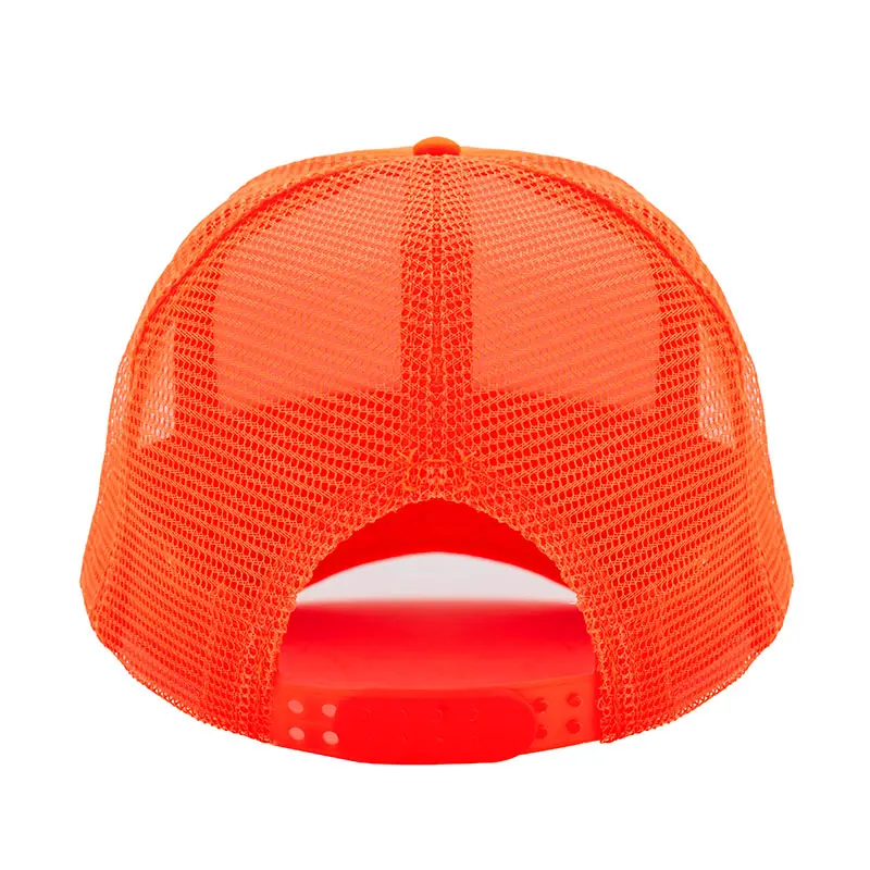 Gorro de 5 paneles en poliéster con parte trasera de tela de red. Disponible en colores fluorescentes: rosa, verde, amarillo, naranja y combinaciones de estos con blanco. Ajuste con broche plástico.