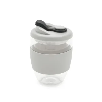 Cuenta con una banda de silicona gris antideslizante personalizable. Con una capacidad de 350 ml, es ideal para disfrutar de tus bebidas favoritas en cualquier momento del día.