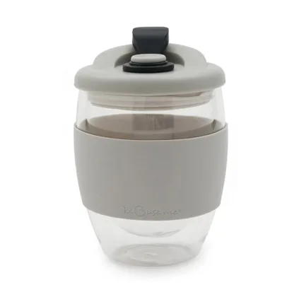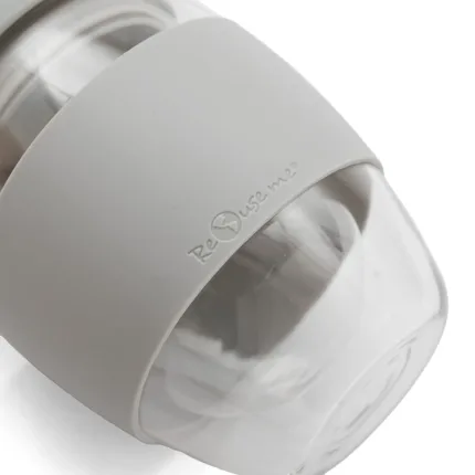 Jarro reutilizable confeccionado en doble pared de vidrio de borosilicato, asegurando que el calor de la bebida no se transmita a las manos. Su tapa con pico y cierre a presión garantiza un uso práctico.