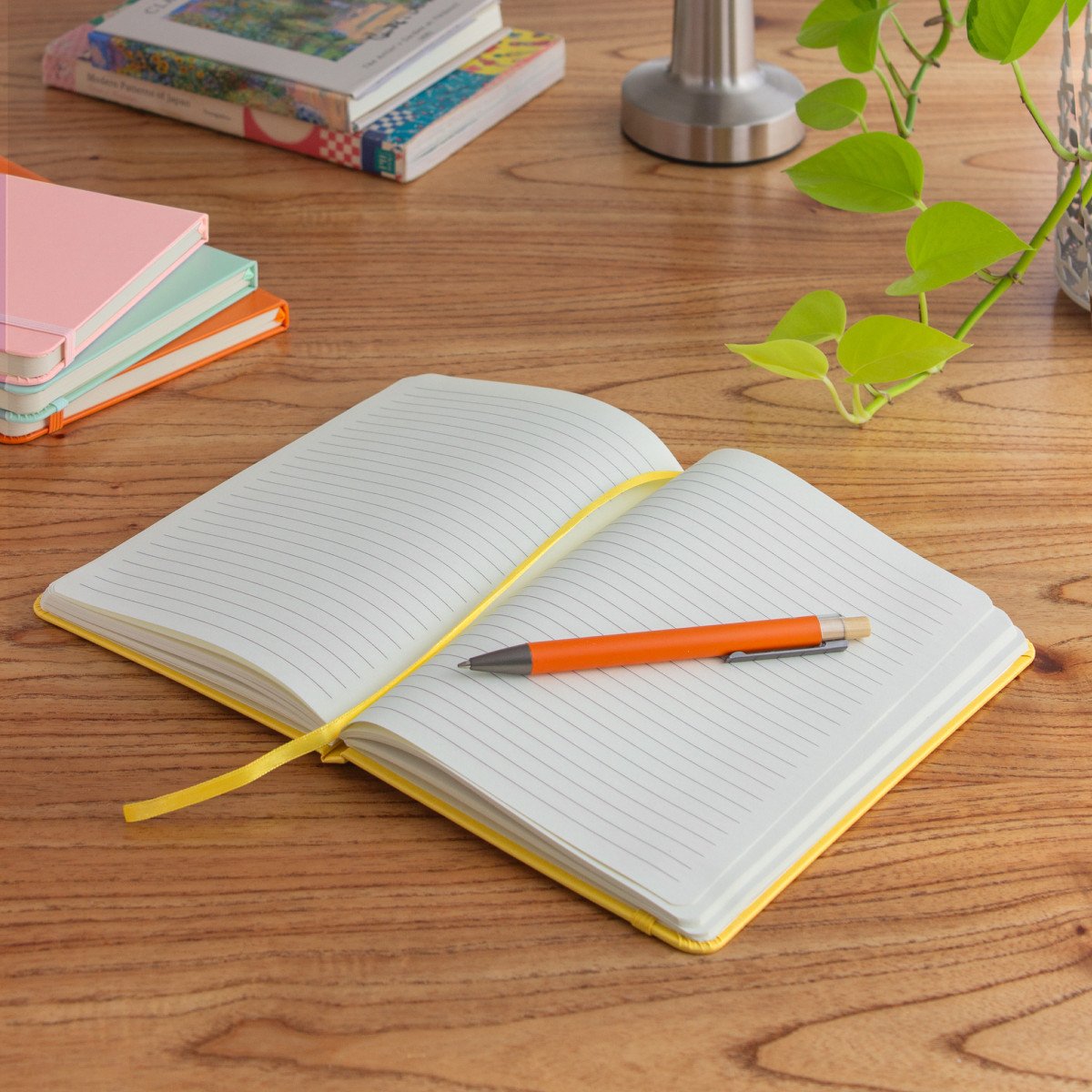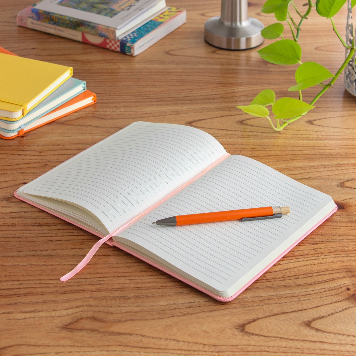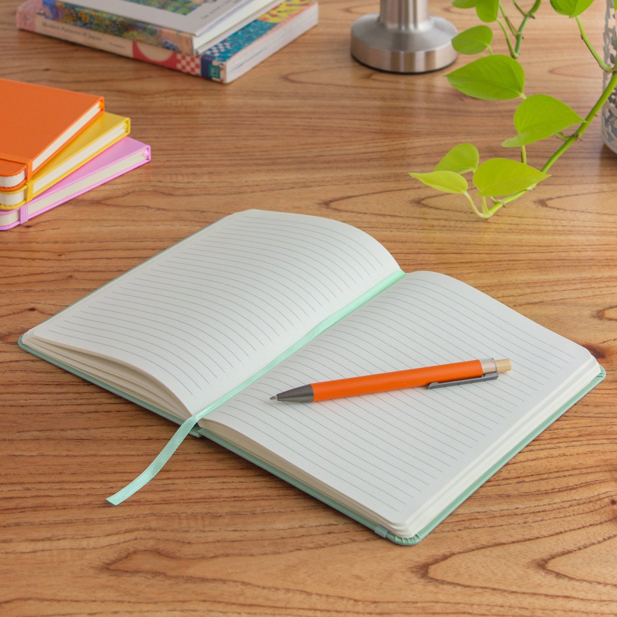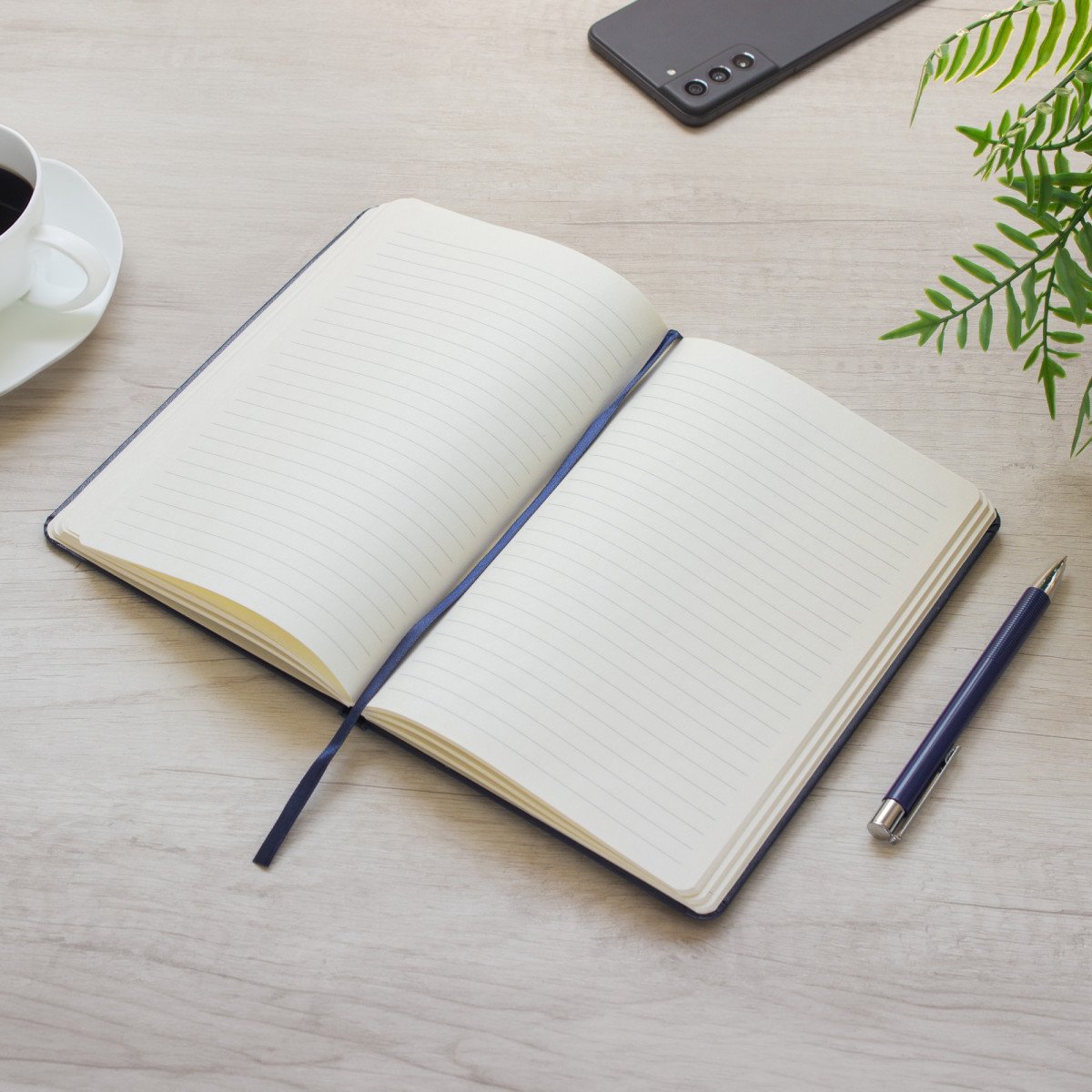 Mantén tus ideas organizadas.Libreta. Tapa de cartón de 300g recubierta en poliuretano de diferentes colores. Interior de 80 hojas rayadas en papel obra crema de 70g. Encuadernación cosida. Incluye cinta señaladora del color de la tapa. Cierre con banda elástica del mismo color.Medidas: 14 x 21 x 1,5 cm.
