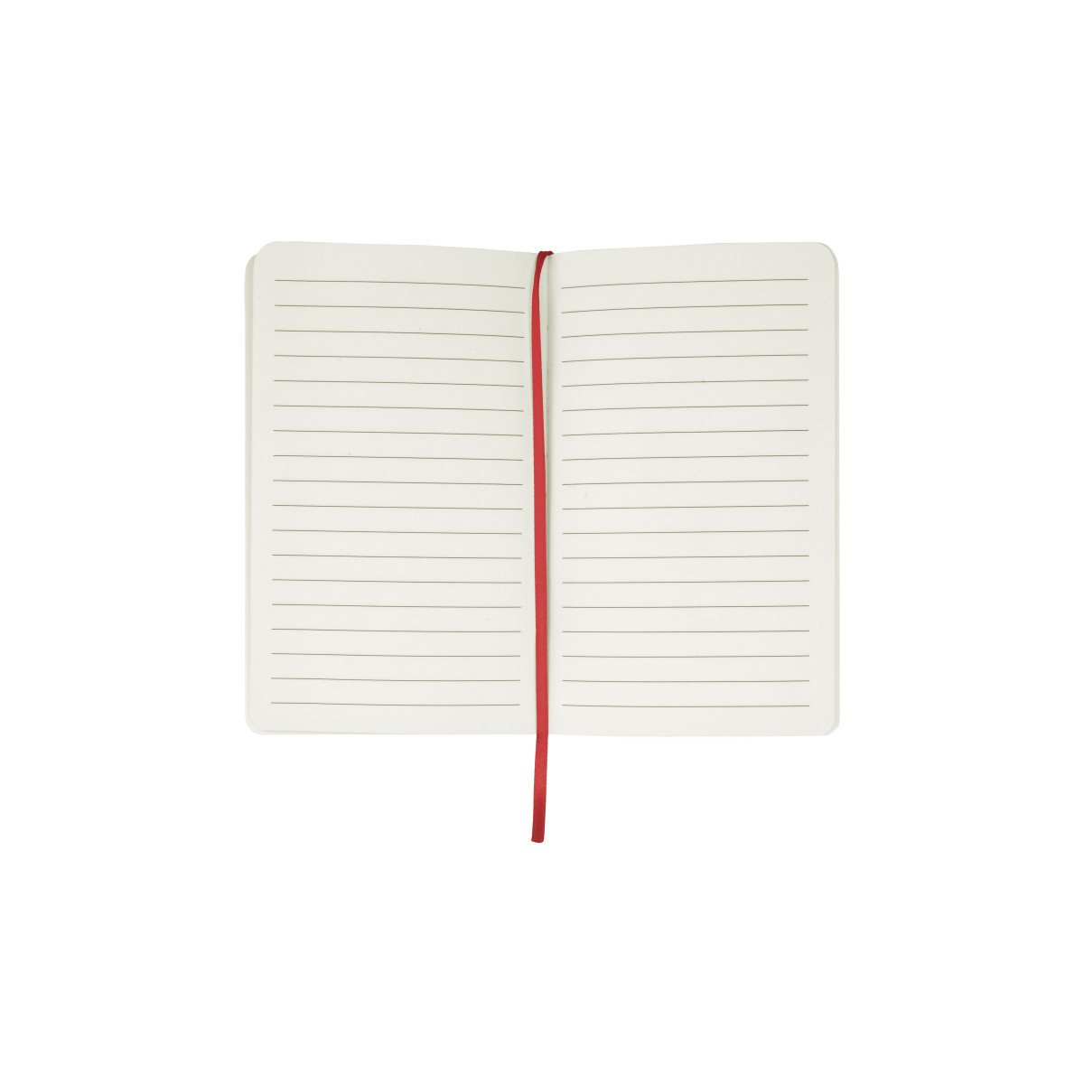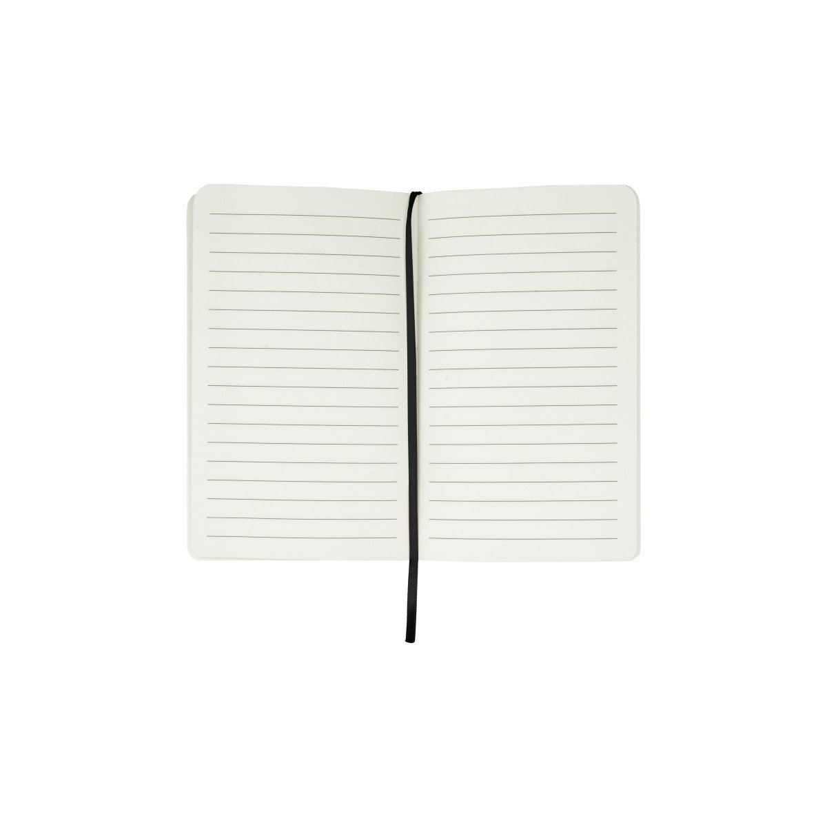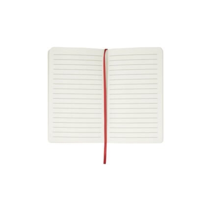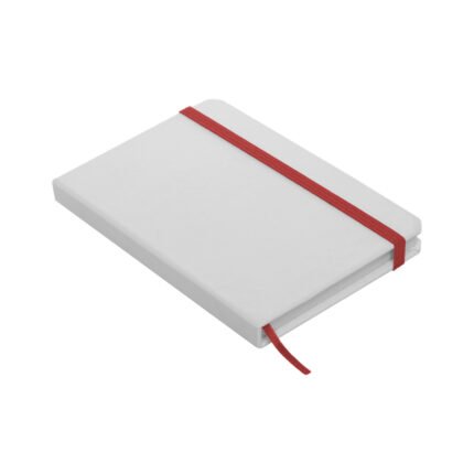 Cartón. 14,3 x 9 x 1,2 cm. Libreta de tapa dura color blanco. Contiene 80 hojas rayadas. Separador en tela y cierre con banda elástica del mismo color.