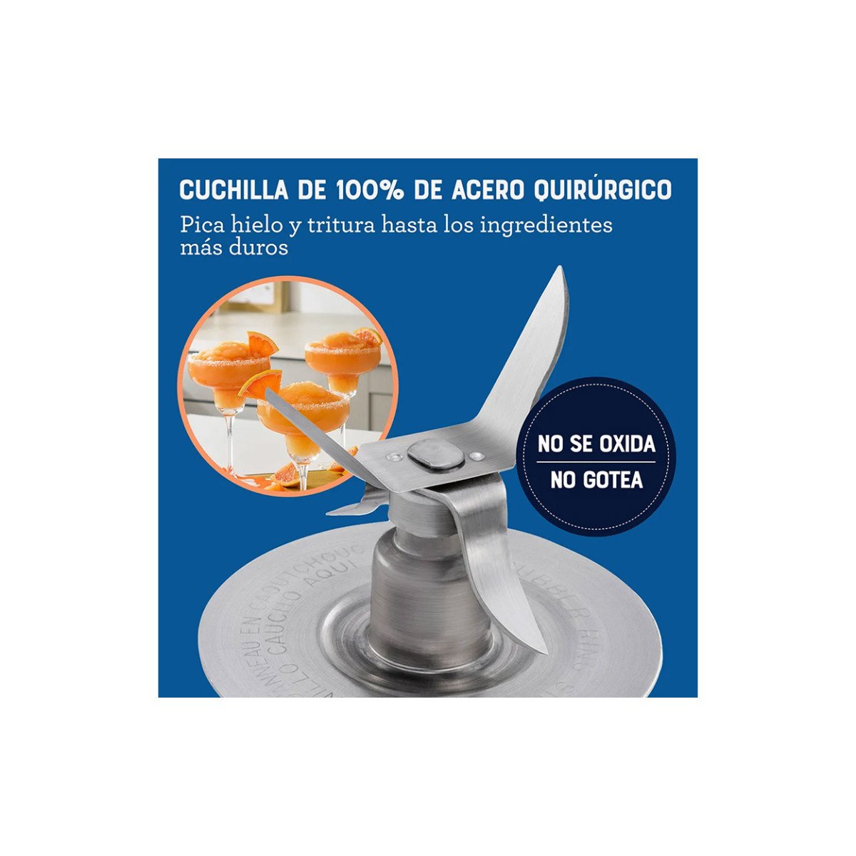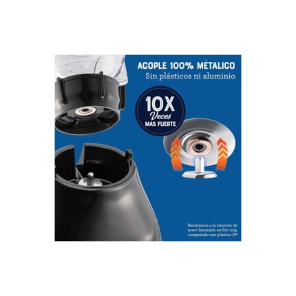 Sistema de acople de metálico entre la cuchilla y el eje de la base que prolonga la vida de la licuadora.