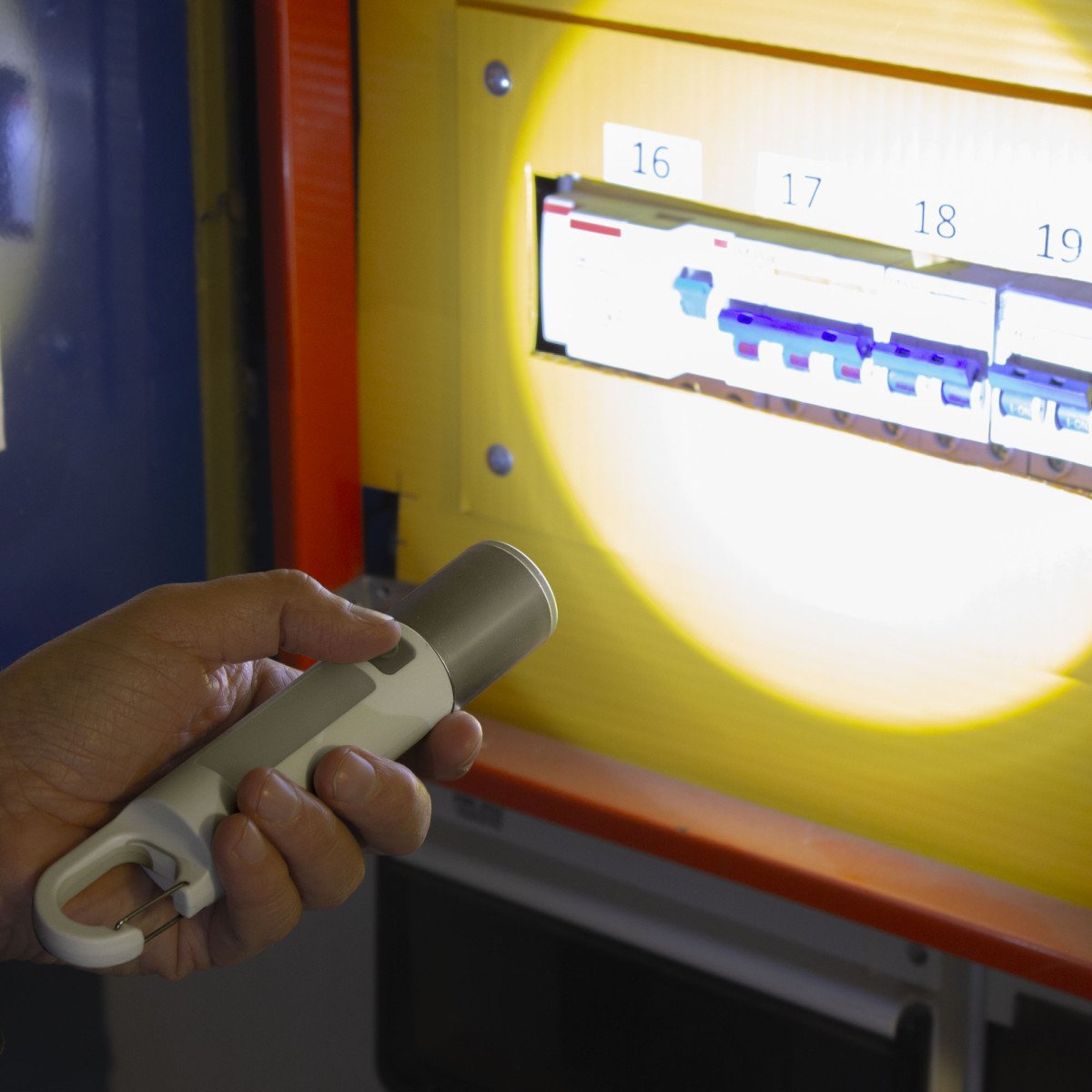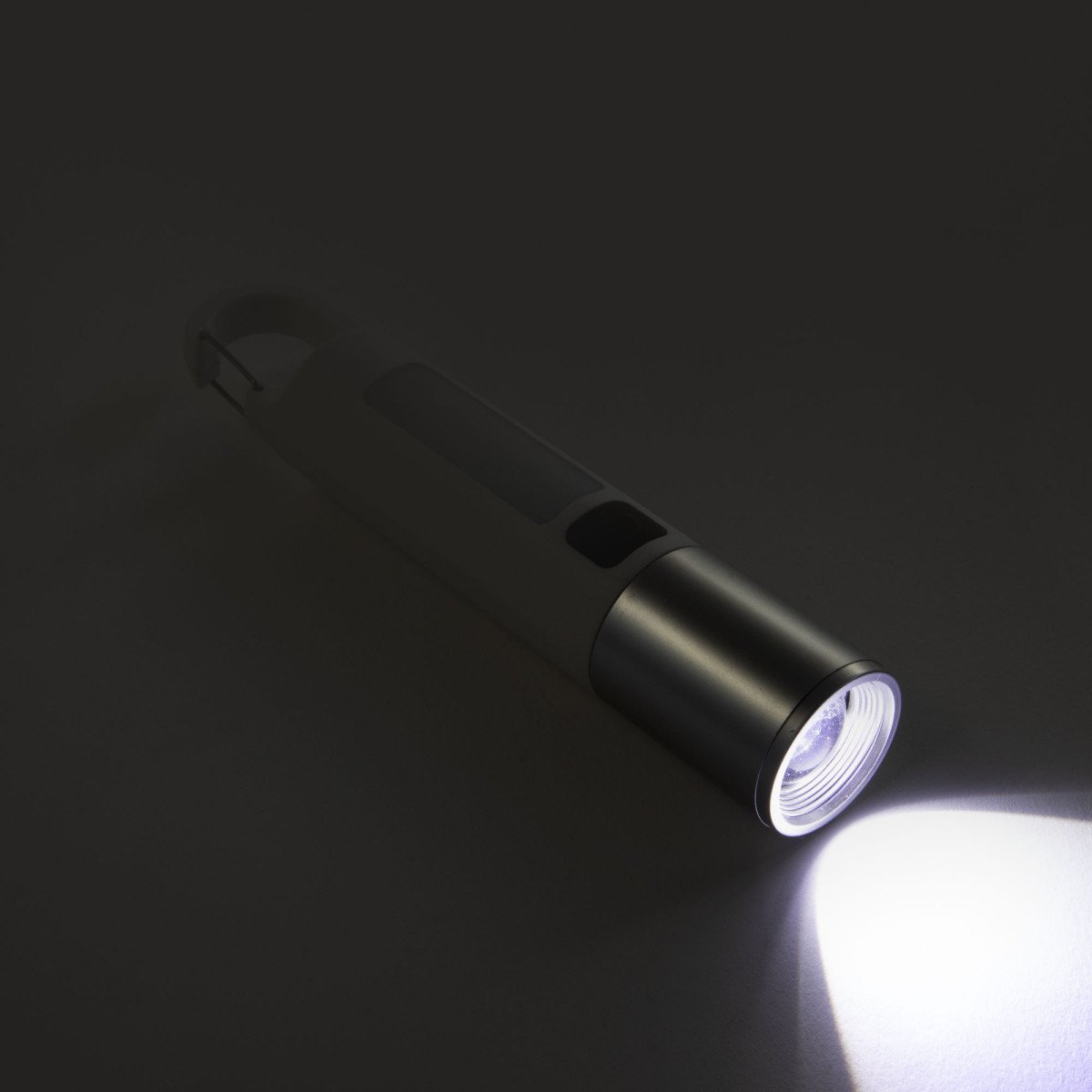 Luz potente siempre a tu alcance.Linterna portátil recargable. Con mosquetón incorporado. Luz de emergencia y 2 intensidades de iluminación (alta e intermitente). Batería recargable 800 mAh. Fuente de luz 7 leds de alta potencia. Puerto USB-C oculto (se desplaza el cuerpo hacia arriba). Cable de carga color blanco.  Medidas: Ø 3 cm x 15,8 cm.