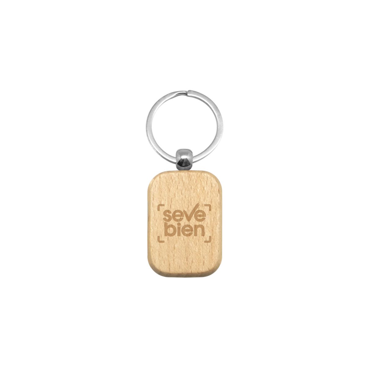 Madera. 4,2 x 3 x 0,7 cm. Llavero rectangular con aro metálico (la medida no incluye el aro).